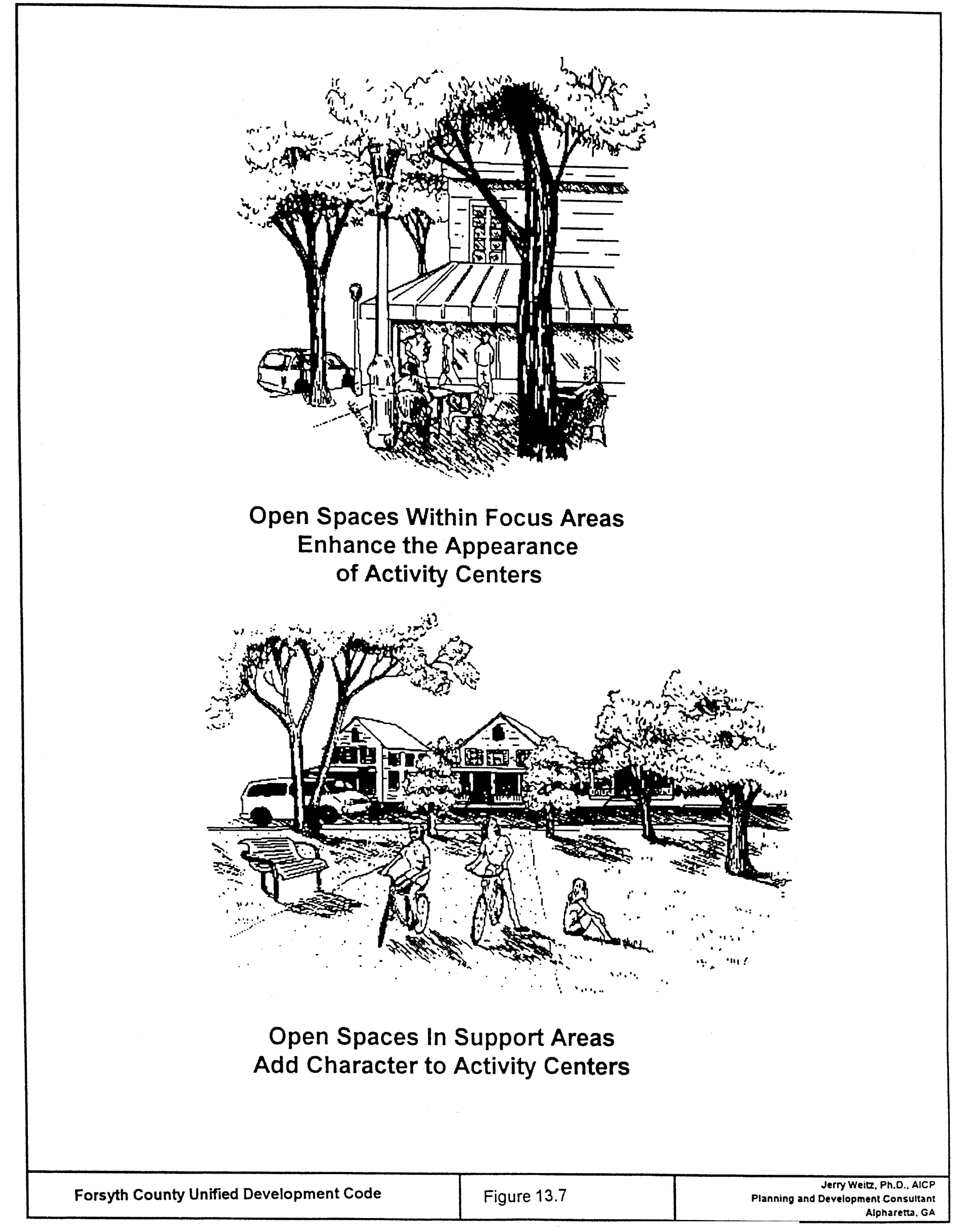 Elements such as landscaping, street furniture, public open spaces and plazas, and amenities create contrast to and soften the built environment by making the walking experience more enjoyable and inviting. Landscape areas should be designed to form plazas, open spaces, and other focal points within the activity center. Pedestrian-oriented public outdoor spaces should be incorporated as design elements into activity centers. These public spaces may include a formal park or town green, small formal parks/plazas, and so forth, as focal points for community interaction. These public spaces should be integrated purposefully into the overall design of the activity center, and not merely be residual areas left over after buildings and parking lots are sited. These spaces should also be placed next to the areas that generate the users, such as street corners, shops and restaurants, stores, daycare, and dwellings.
