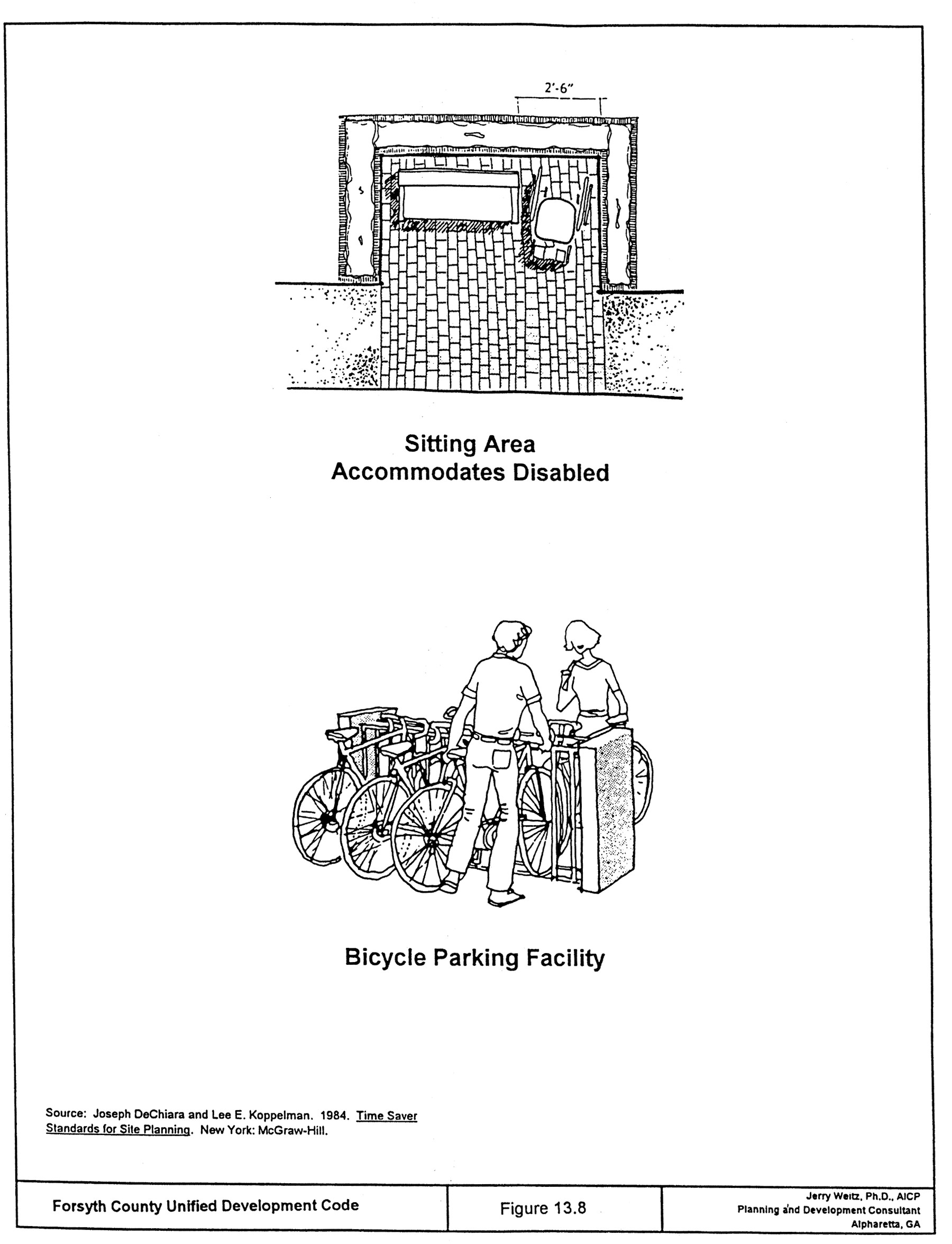 Street furniture, including benches, and trash receptacles (waste bins) should be provided at transit stops. Any architectural theme for street furniture should be continued and extended throughout the development, especially along the same road frontage, in order to provide the link of consistence and uniformity needed to create and expand the activity center concept. Street furniture plans should include pedestrian walk lighting, trash receptacles (waste bins), and seating facilities for every 400 feet of walk. Advertising is not permitted on street furniture or transit shelters. Phone booths and information displays showing transit routing are also encouraged.