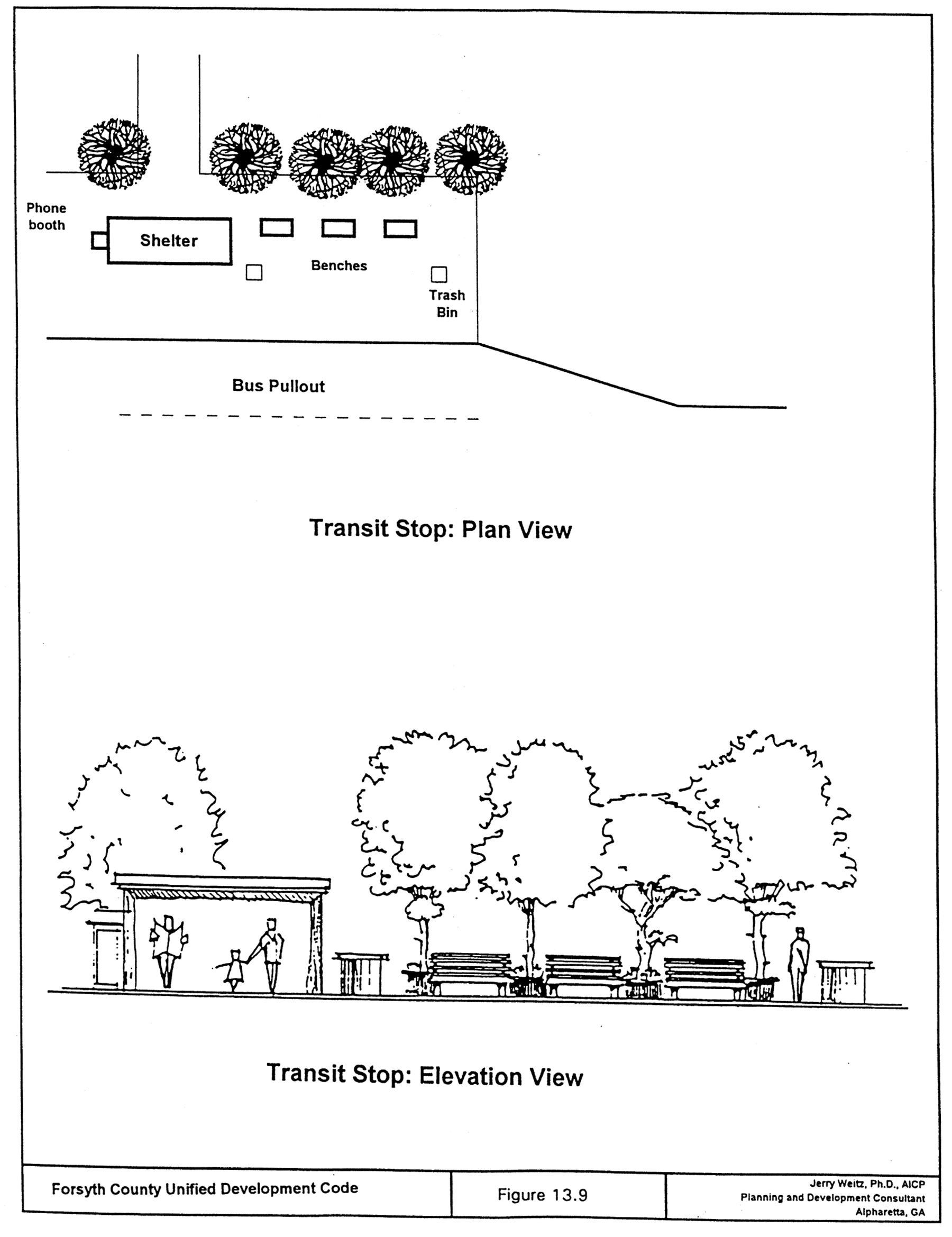 Activity centers should accommodate existing bus stops or include location(s) for future local transit stop(s), sited in accordance with long range county plans for transit. Transit stops should include a bus pullout bay, designed to appropriate standards of the county or transit provider. All transit stop facilities must be designed to ensure safe movement of pedestrians and the handicapped.