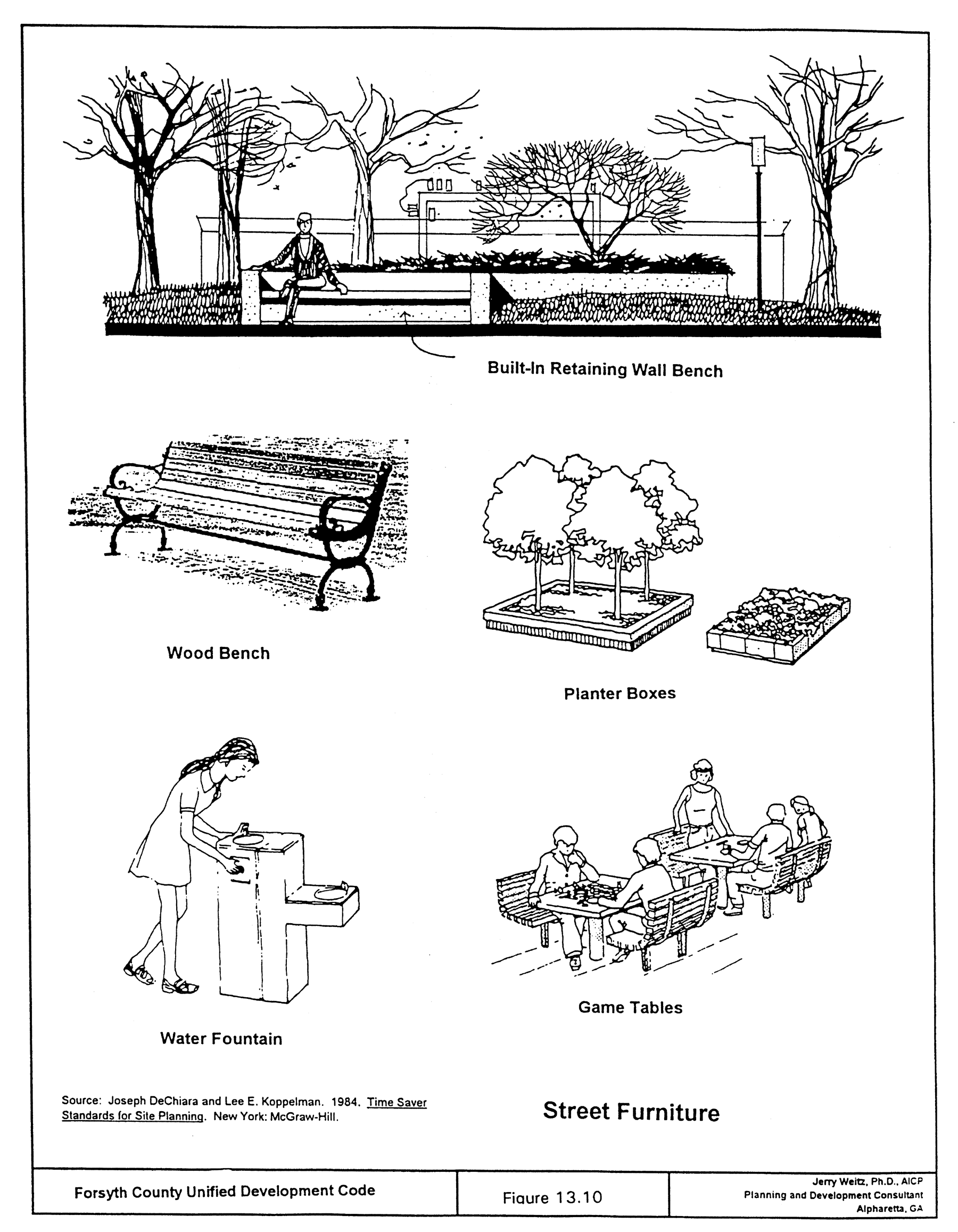 Within an activity center, street furniture (e.g., benches, trash receptacles), lighting, and sensitively arranged uses such as outdoor cafes should be provided to encourage human interaction and street life. Street furniture, including benches, and trash receptacles (waste bins) should be provided along streets in focus areas and preferably extended with the same architectural theme along public streets in the support areas of the activity center as well. Street furniture plans should include pedestrian walk lighting, trash receptacles (waste bins), and seating facilities for every 400 feet of walk. Advertising is not permitted on street furniture. Public telephones and water fountains are encouraged. Outdoor public art may be provided in open spaces, plazas, and along streetscapes to provide visual interest and diversity.