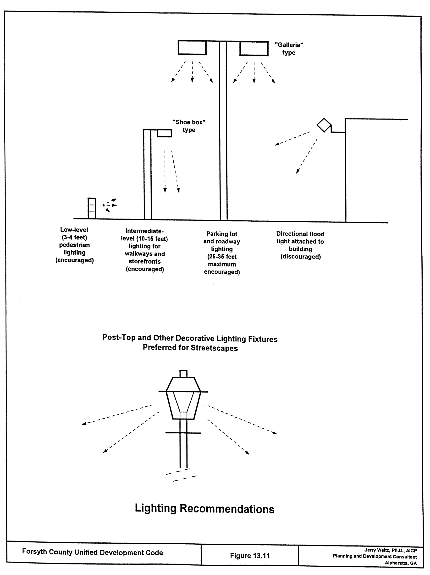Lighting should be used to highlight or accent architectural features and create visual interest. Exterior neon lighting, illuminated banding, or other lighting that creates a glow is strongly discouraged unless approved as part of an overall theme for the activity center. The style of lighting should reflect the architectural character of the activity center. Post top lighting fixtures and poles and decorative lamps are strongly preferred.