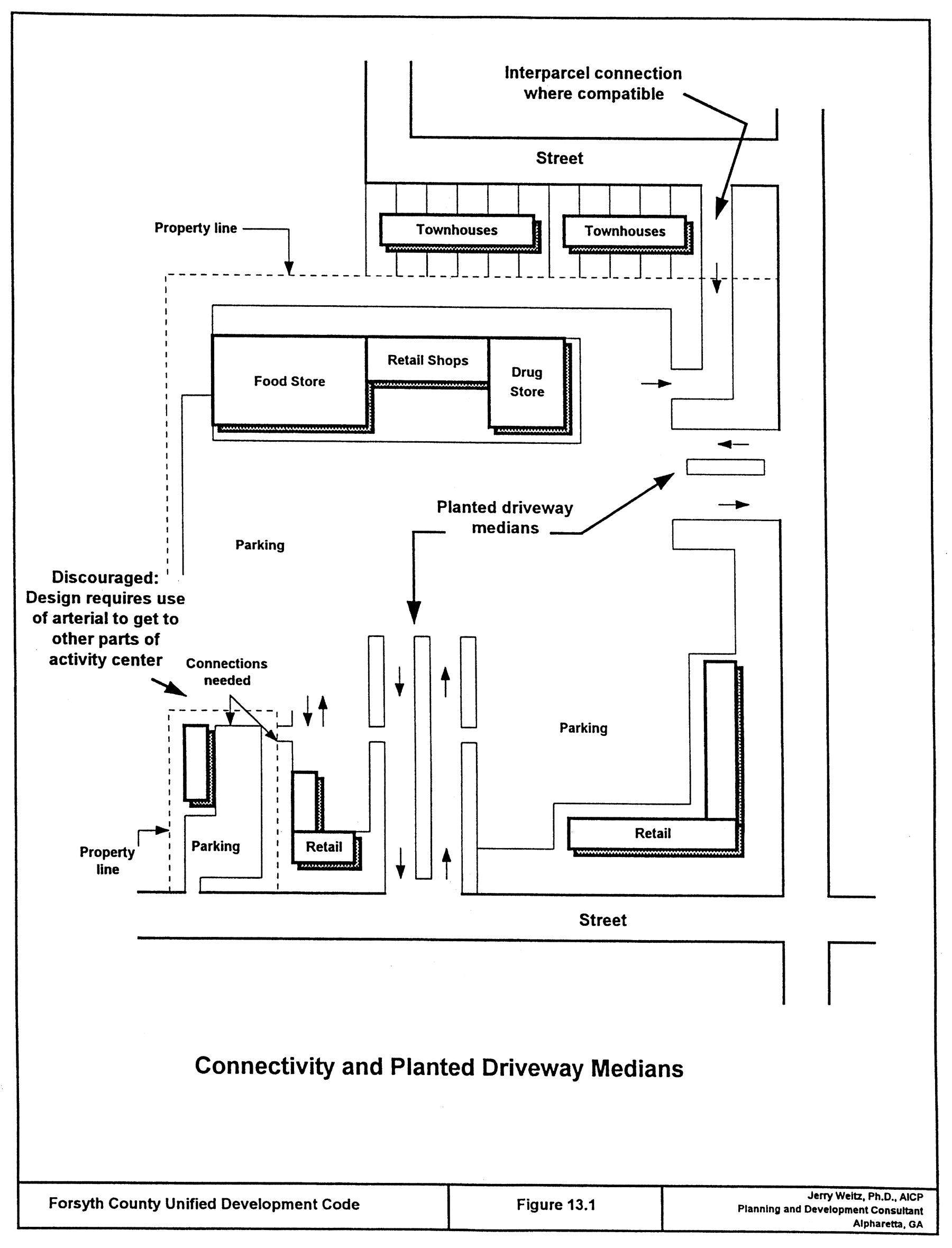 Where compatible, automobile trips from adjacent residential neighborhood(s) to the neighborhood shopping zoning district or urban village zoning district should be possible without requiring travel along the major street. Outparcels should be connected to and served from the internal streets of the activity center of which they are a part. Major driveways serving the activity center should include planted center medians. Planted medians are desired because they: 1) enhance the overall appearance of the activity center and improve economic attractiveness; 2) provide refuge for pedestrians; and 3) improve traffic safety. Road speeds within an activity center should generally not exceed 30 mph, and should be compatible with the pedestrian nature and scale of the activity center.