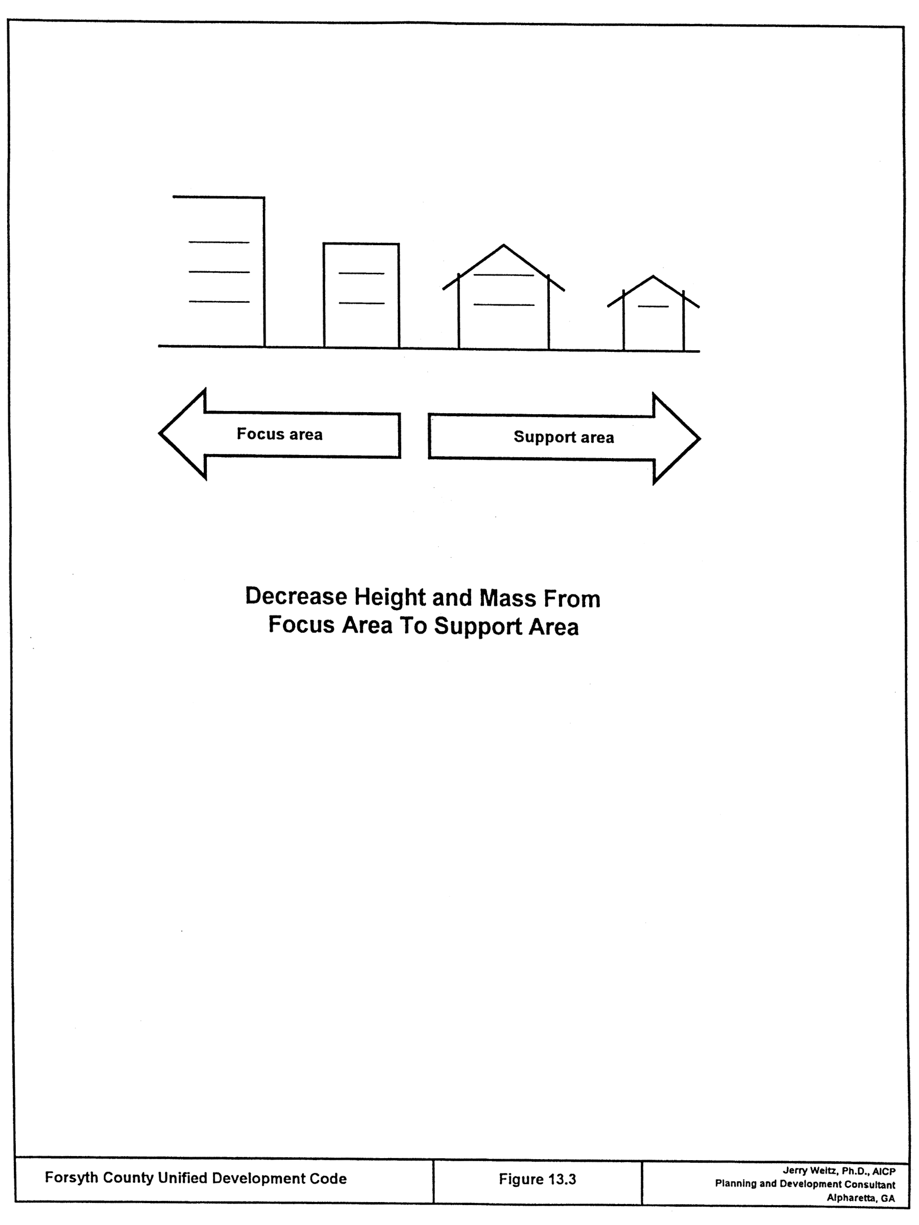 Within an activity center, a logical hierarchy of building forms should be created. Building heights and masses should be greatest in the focus area and inner portion of the support area (the part closest to the focus area), and should transition to lower heights and less mass outward from the focus area to the outer edge of the support area. Building massing should be varied to create a logical hierarchy of building forms, to break up long expanses of façade, and to create shade and shadow. Buildings at the outer edge of an activity center's support area should be comparable in height and mass with the surrounding neighborhood beyond the support area.