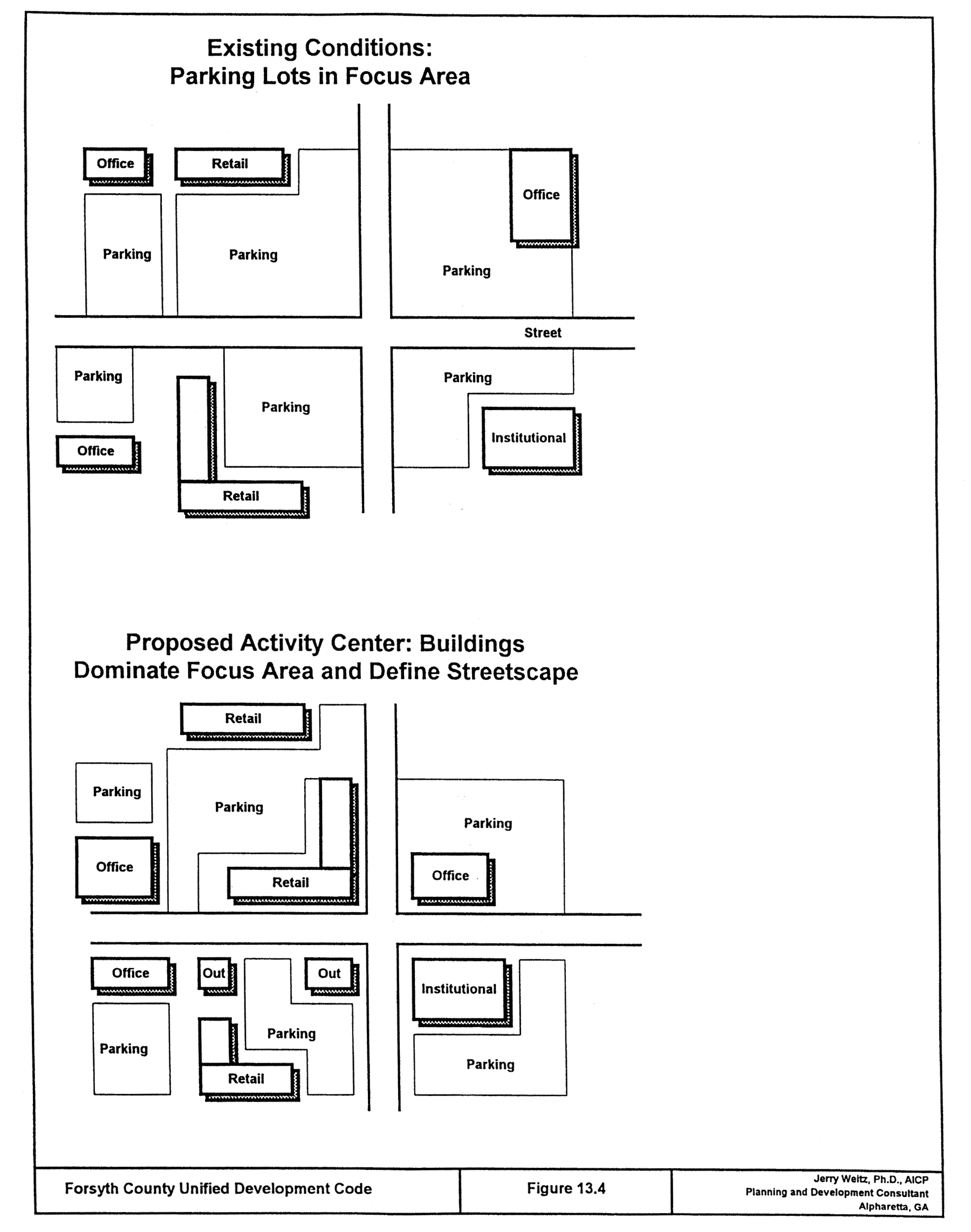 As far as practicable, buildings in activity centers should not be separated from fronting streets by large parking lots. At a minimum, placement of outparcel buildings between a large parking lot and the street should be used to help define the streetscape, and lessen the visual impact of the parking lot from the street. Whenever an activity center is split across streets or quadrants of an intersection, the buildings on the different quadrants of the street should not be separated from each other by parking lots. The line and massing of the buildings and structures on each quadrant should be arranged such that they are as close to each other as possible and linked by crosswalks and pedestrian paths, so as to encourage pedestrian movement between the quadrants on opposite sides of the street(s).
