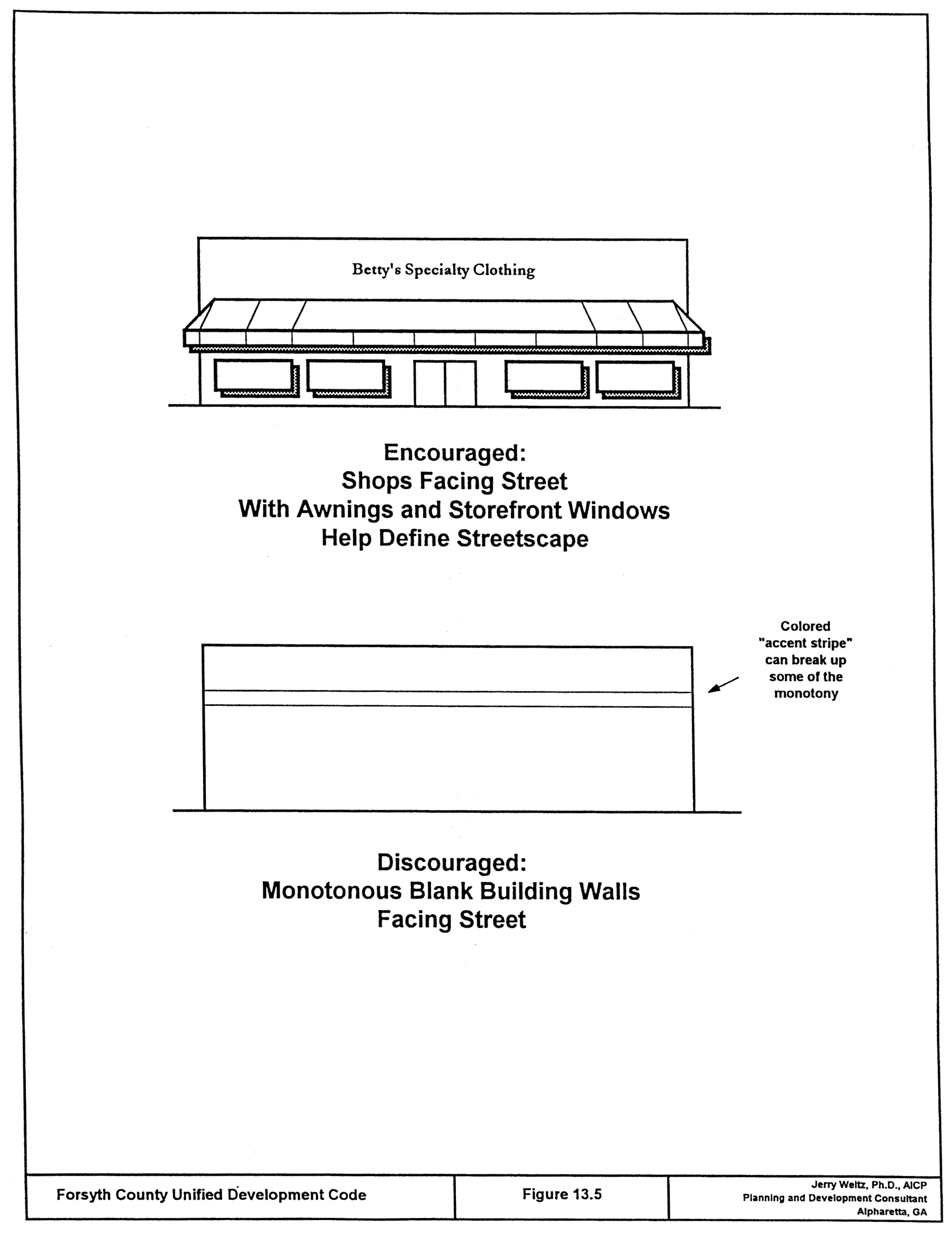 Buildings that are oriented towards the fronting street(s), and buildings located in relatively close relation to fronting street(s) should include architectural elements such as canopies or awnings and street-level display windows. Covered building fronts facing streets should not be permanently enclosed. Soft, flameproof awnings are encouraged over the first floors of buildings facing streets.
