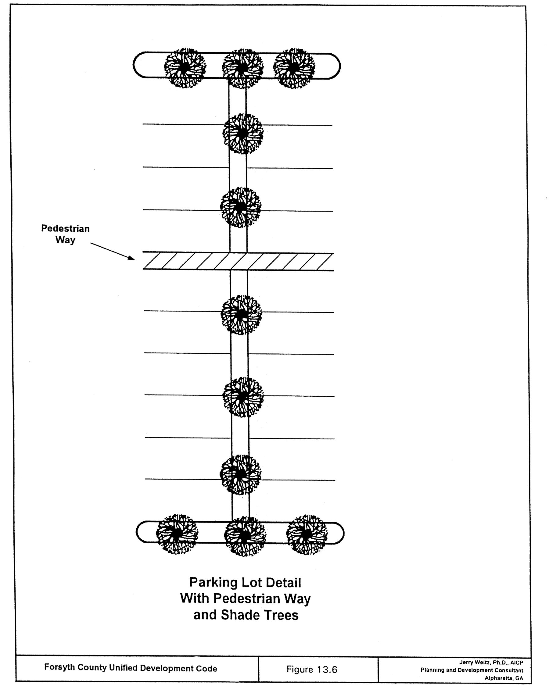 Parking aisles should be separated from one another by planted medians with shade trees. When possible, it is recommended that parking aisles and their shade trees be aligned in a solar orientation to cast shade on parked cars during the summer months, if such an orientation does not compromise other design criteria in this chapter.