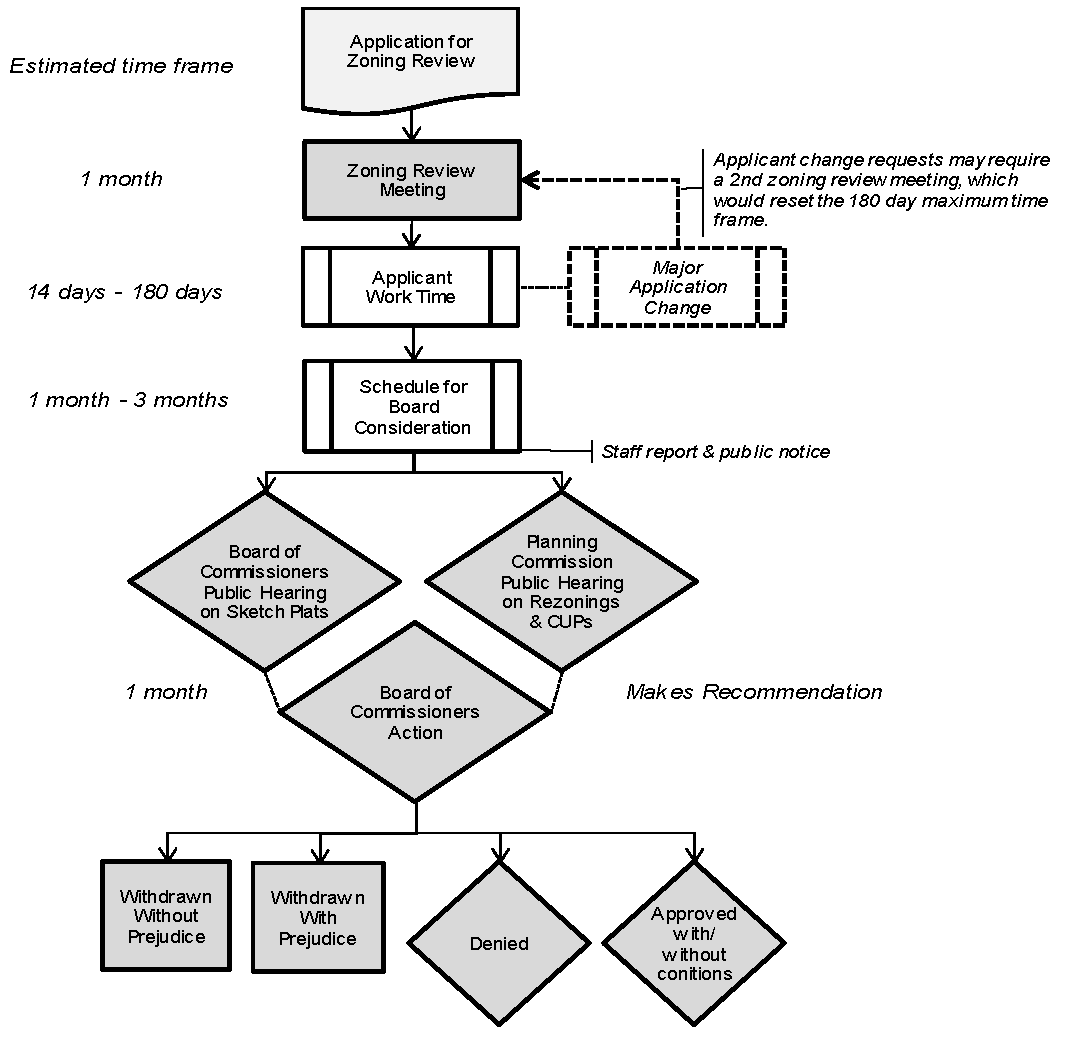 The following requirements shall be submitted for all applications, unless otherwise specified in the text of this chapter. Additional requirements that vary per application type are delineated in articles IV through X of this chapter. County initiated applications are exempt from these requirements, but shall otherwise follow all requirements of the Georgia Zoning Procedures Act. A summary of application requirements can be found in Table 8.1. An optional pre-application meeting may be requested by the applicant to discuss the general aspects of the proposal, the process, and information that will be required from the applicant in order to submit a complete application. Preliminary discussions are not binding on either the applicant or the county. This is often the first opportunity to review submittal requirements and procedures and is intended to assist in filing complete applications.