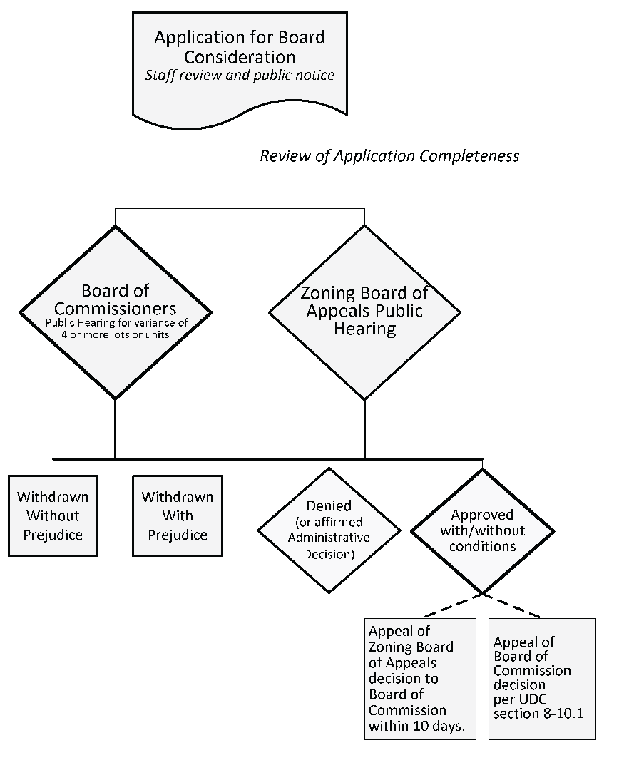 Zoning board of appeals. The zoning board of appeals is hereby designated as the board that shall hold a public hearing on all appeals of administrative decisions and all variances; with the exception of variance requests that are approved administratively pursuant to 8-6.4(a); variance requests that would simultaneously apply to four or more existing or proposed lots or units within a single subdivision; variance requests for undisturbed areas of separation as described in section 18-12.1 of this Code; or for variance requests that were filed and scheduled to be considered simultaneously and pertaining to the same property with another application in which the authority to hold the public hearing rests with either the planning commission or board of commissioners.