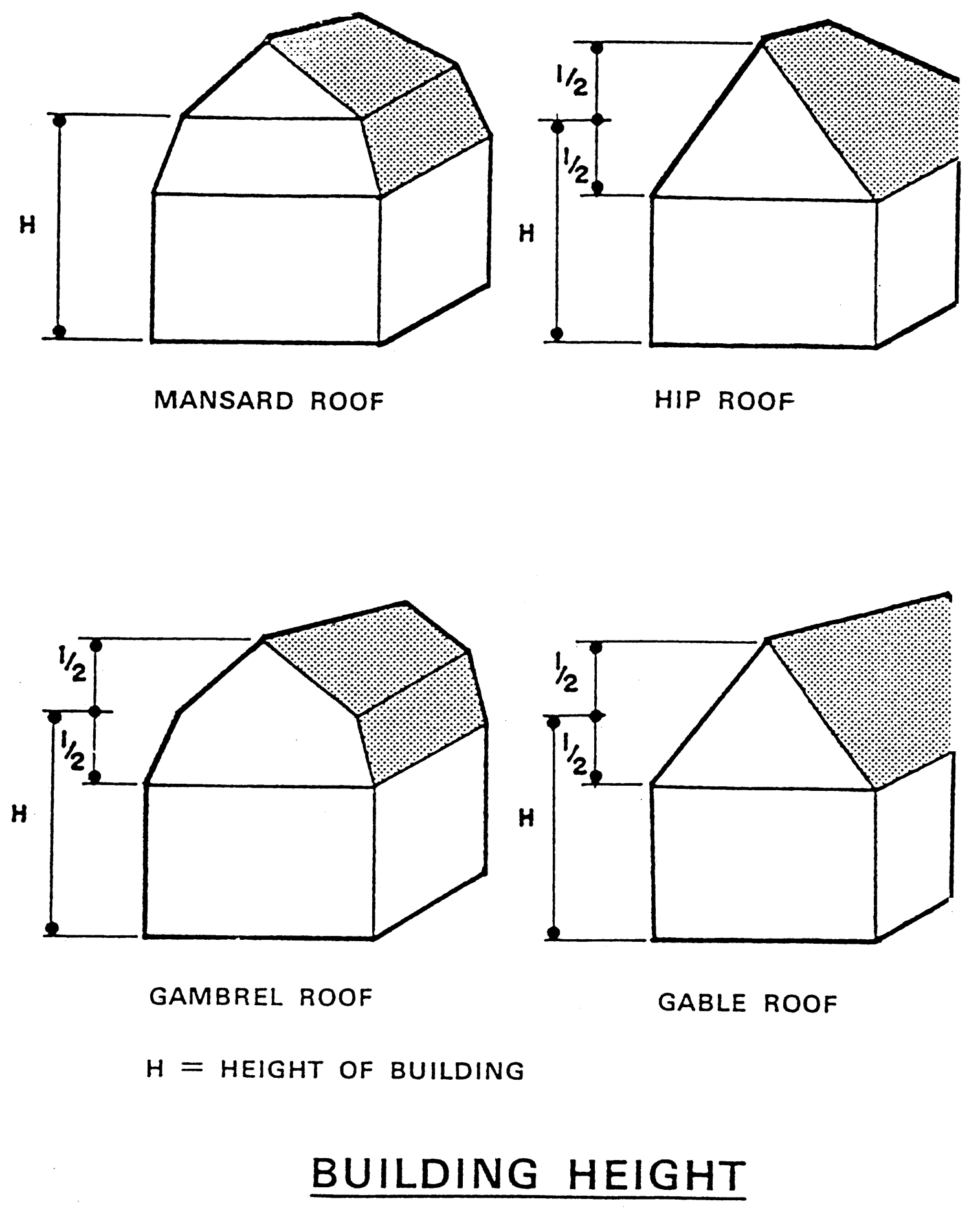 Building height means the vertical distance measured from the established grade to the highest point of roof surface for flat roofs; to the deck line of mansard roofs; and to the average height between eaves and ride for gable, hip, and gambrel roofs. Where a building is located on sloping terrain, the height may be measured from the average ground level of the grade at the building wall.