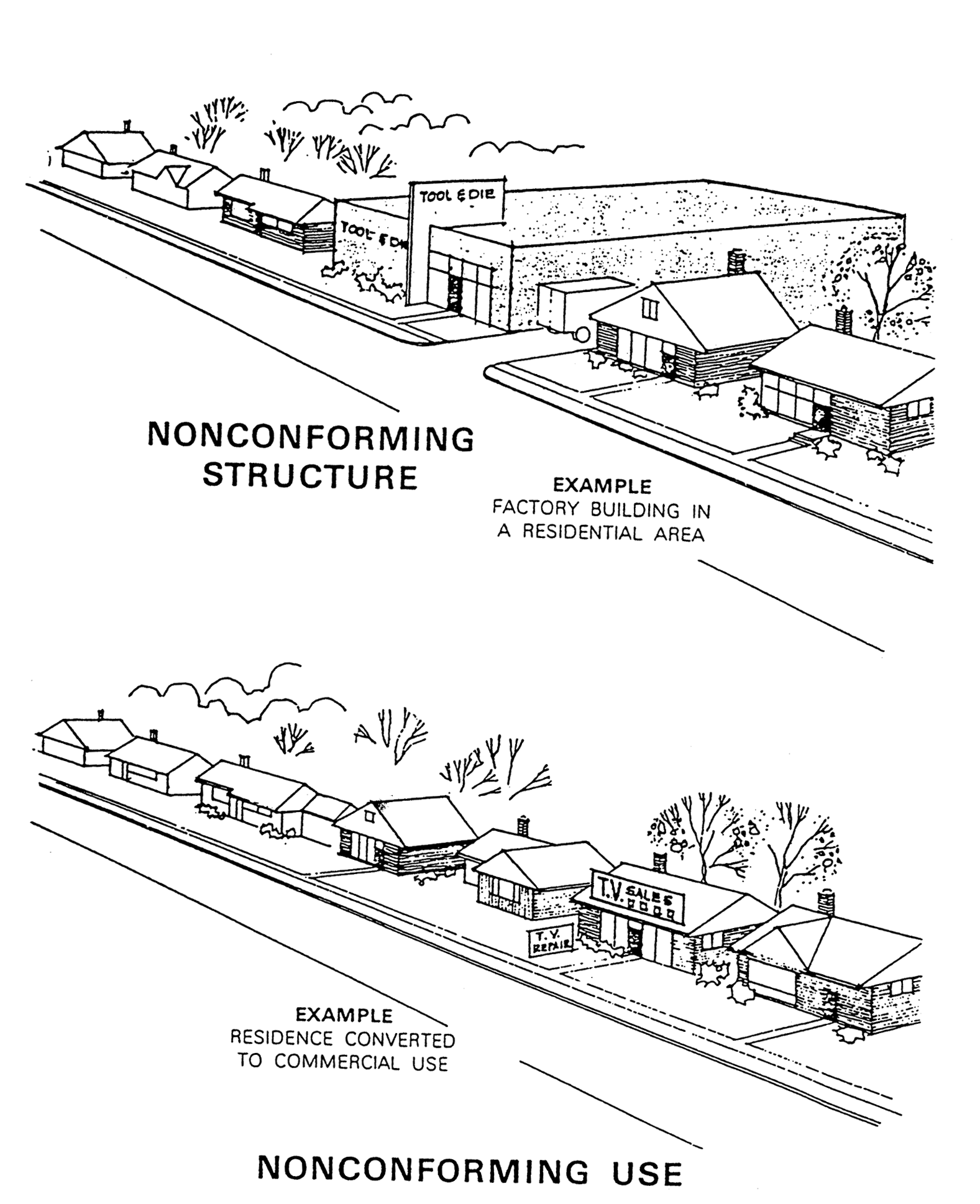 Nonconforming structure means a lawfully occupied building or land at the effective date of the ordinance, or amendments thereto, from which this chapter is derived and that does not conform to the use regulations of the district in which is located.