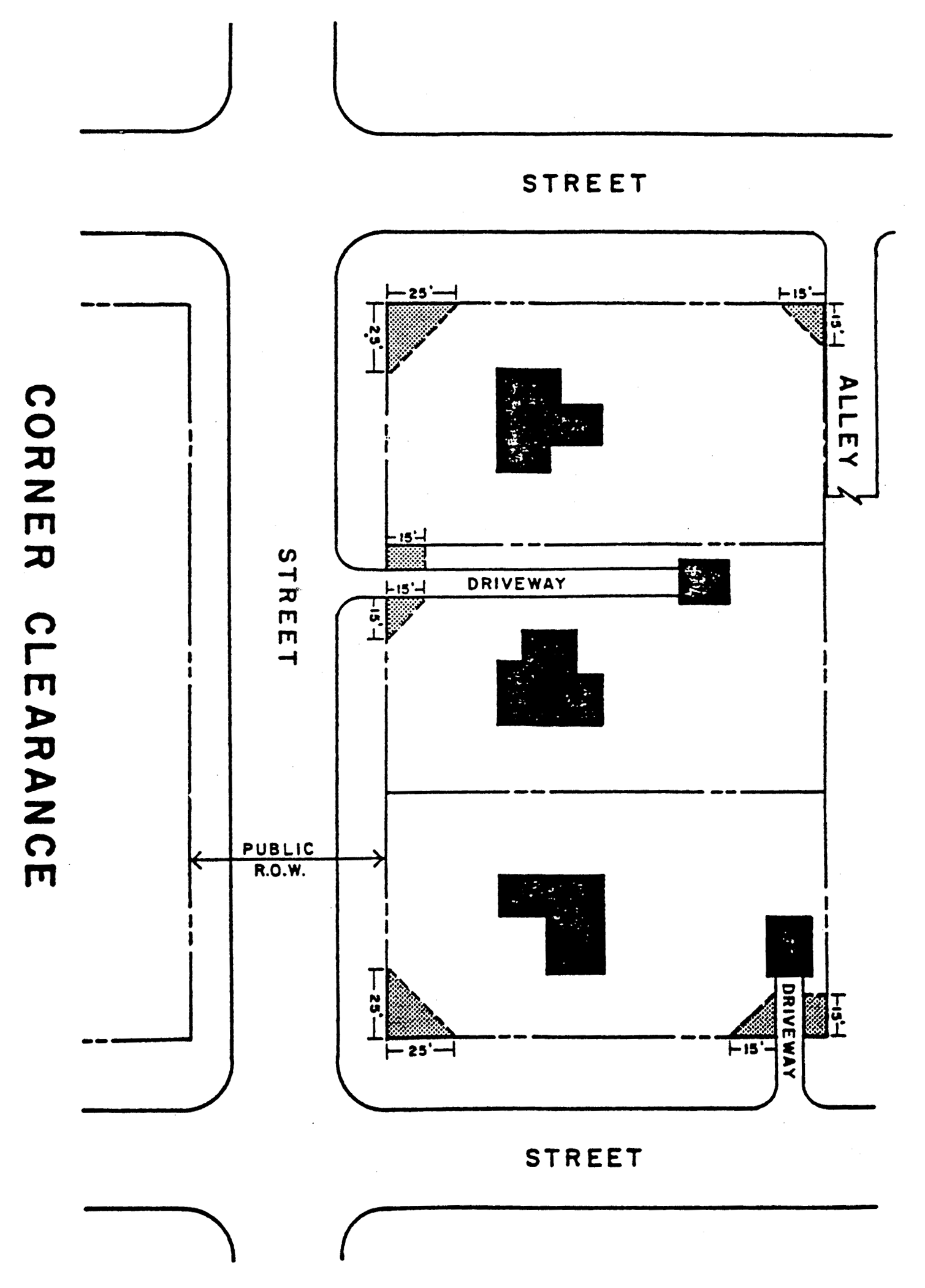 Minimum corner clearance of driveways from intersecting streets. The location of driveways adjacent to intersecting streets shall conform to the minimum corner clearances provided in Figure 1.