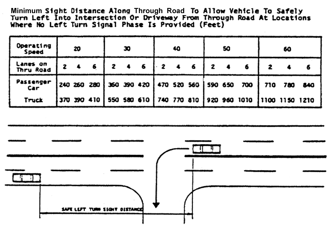 Minimum Sight Distance Along Through Road To Allow Vehicle To Safely Turn Left Into Intersection Or Driveway From Through Road At Locations Where No Left Turn Signal Phase Is Provided (Feet)