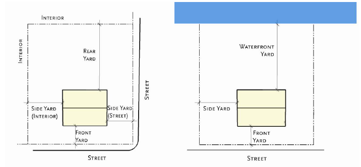 There are five types of yards - front, side (street), side (interior), rear, and waterfront yard.