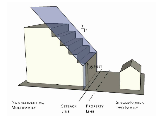 Bulk plane. Any new building that abuts an existing RS- district shall be subject to a bulk plane starting at 35 feet in height at the side or rear setback line, and extending upward one additional foot for every additional foot into the site from the setback line.