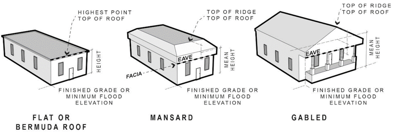 Determination. Height shall be determined by the vertical distance measured from the mean finished grade to the highest point of the roof surface of a flat or Bermuda roof, the mean height between the facia and highest point of a mansard roof and to the mean height level between eaves and ridge of gable, hip and gambrel roofs. Where minimum floor elevations in flood hazard areas have been established by law, height shall be measured from such required minimum floor elevations.