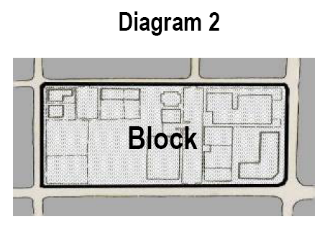 Block means the aggregate of lots, paths and passages, lanes and alleys, enclosed by other thoroughfares. See Diagram 2.