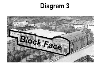 Block face means the aggregate of all the building facades on one side of a block. The block face provides the context for establishing architectural harmony. See Diagram 3.