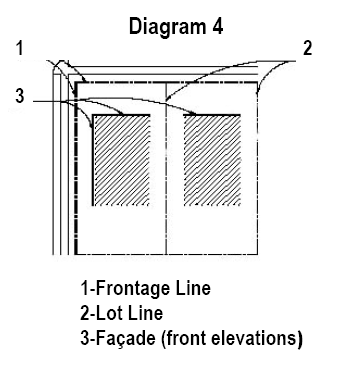 Frontage line means those lot lines that coincide with a public thoroughfare or a civic space. Those frontages on an A street shall be considered to be primary frontage lines. Facades along frontage lines define the public realm and are therefore more highly regulated than other elevations. For this reason, all frontage lines shall meet the facade treatment requirements to the greatest extent possible. See Diagram 4.