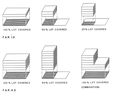 Floor area ratio (FAR) means the calculation determined by dividing the non-residential floor area of all floors within buildings on a lot by the area of that lot. FAR is used as a measurement of non-residential development intensity. See Diagram 5.