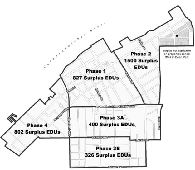 Surplus equivalent dwelling units (EDUs) by Utility System Phase. The surplus EDUs indicated for each Utility System Phase are cumulative maximums for each phase. Available EDUs on a site specific basis are subject to the infrastructure in the immediate vicinity serving the specific site, on a sub-phase level. These more specific sub-phase capacities are identified and depicted in the Downtown and Midtown Fort Myers Utility Capacity Analysis (January 2017), as may be updated from time to time, on file with the Fort Myers Community Development Department. One EDU is based on the estimated wastewater production of one single family dwelling unit. Each multifamily dwelling unit shall be considered 0.5 EDU. 1,000 square feet of nonresidential area shall be considered 1 EDU.