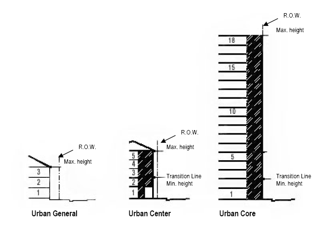 Transition line means a horizontal line, the full width of a facade, expressed by a material change or by a continuous horizontal articulation such as a cornice or a balcony.