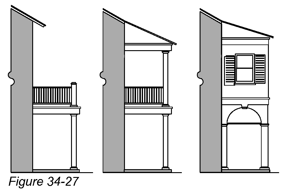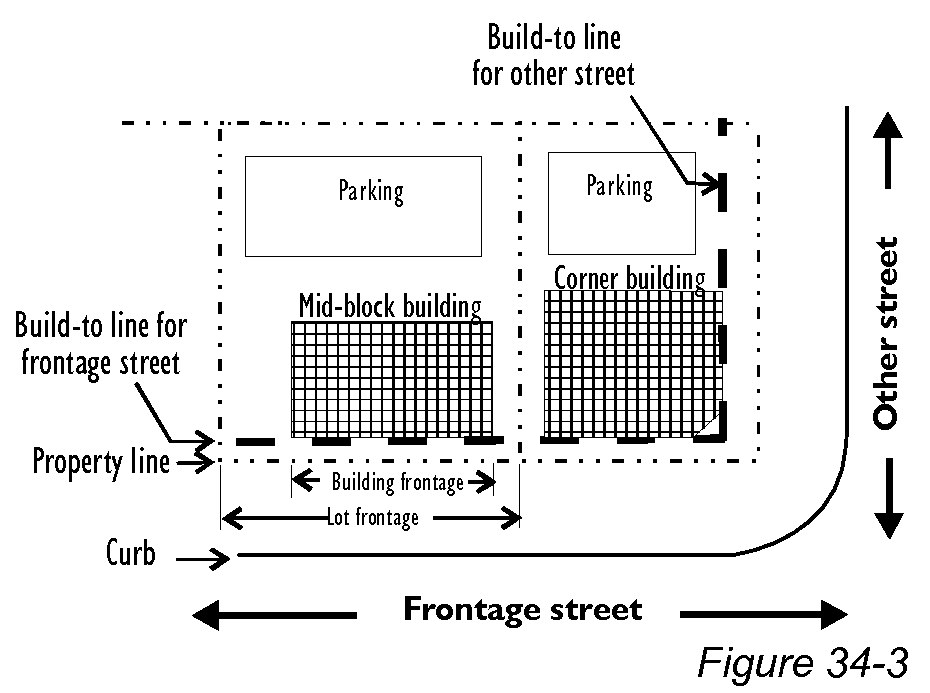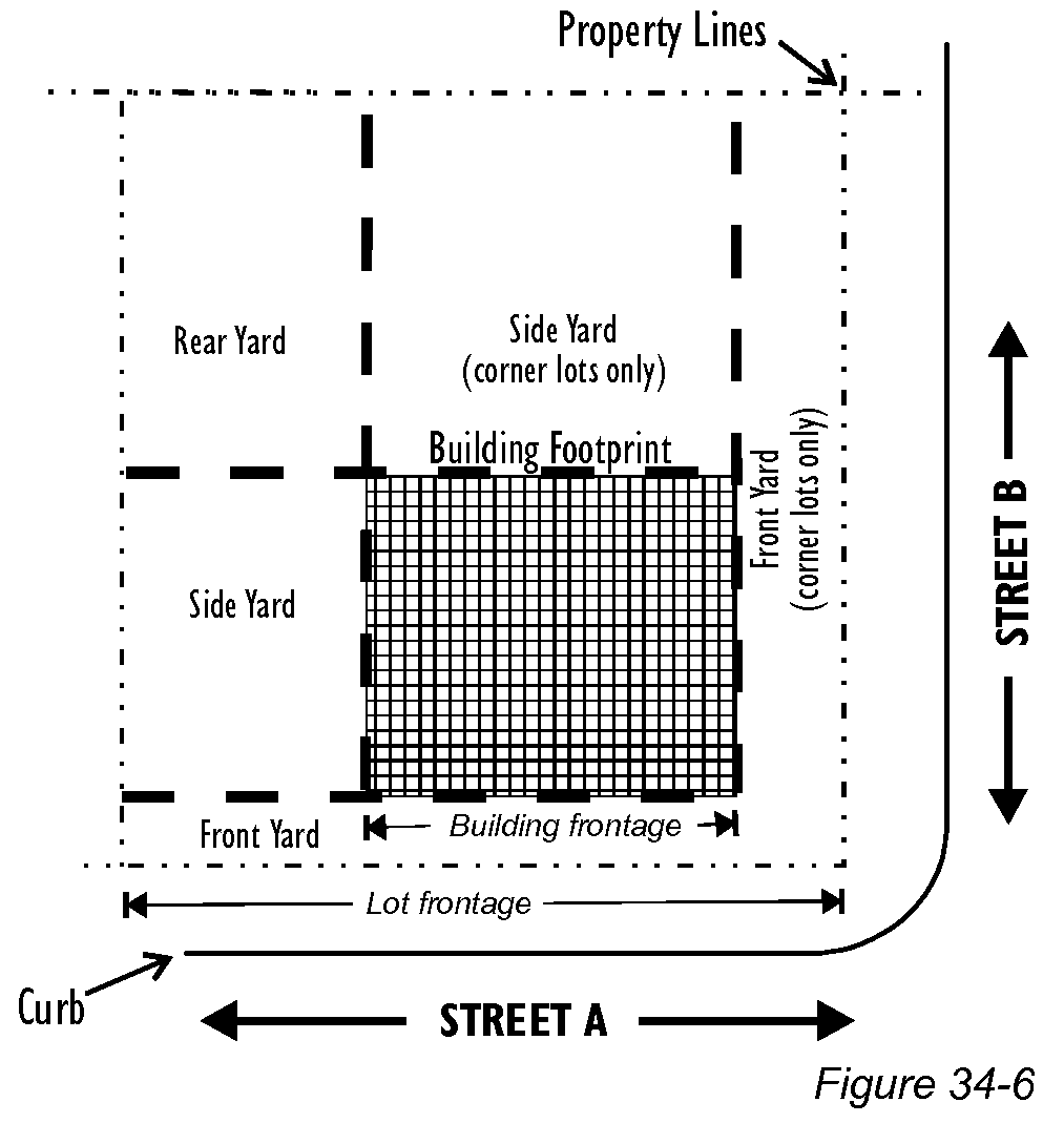 Parking lot locations. Off-street parking lots shall be placed in side or rear yards (see Figure 34-5). Off-street parking lots are not permitted in front yards.