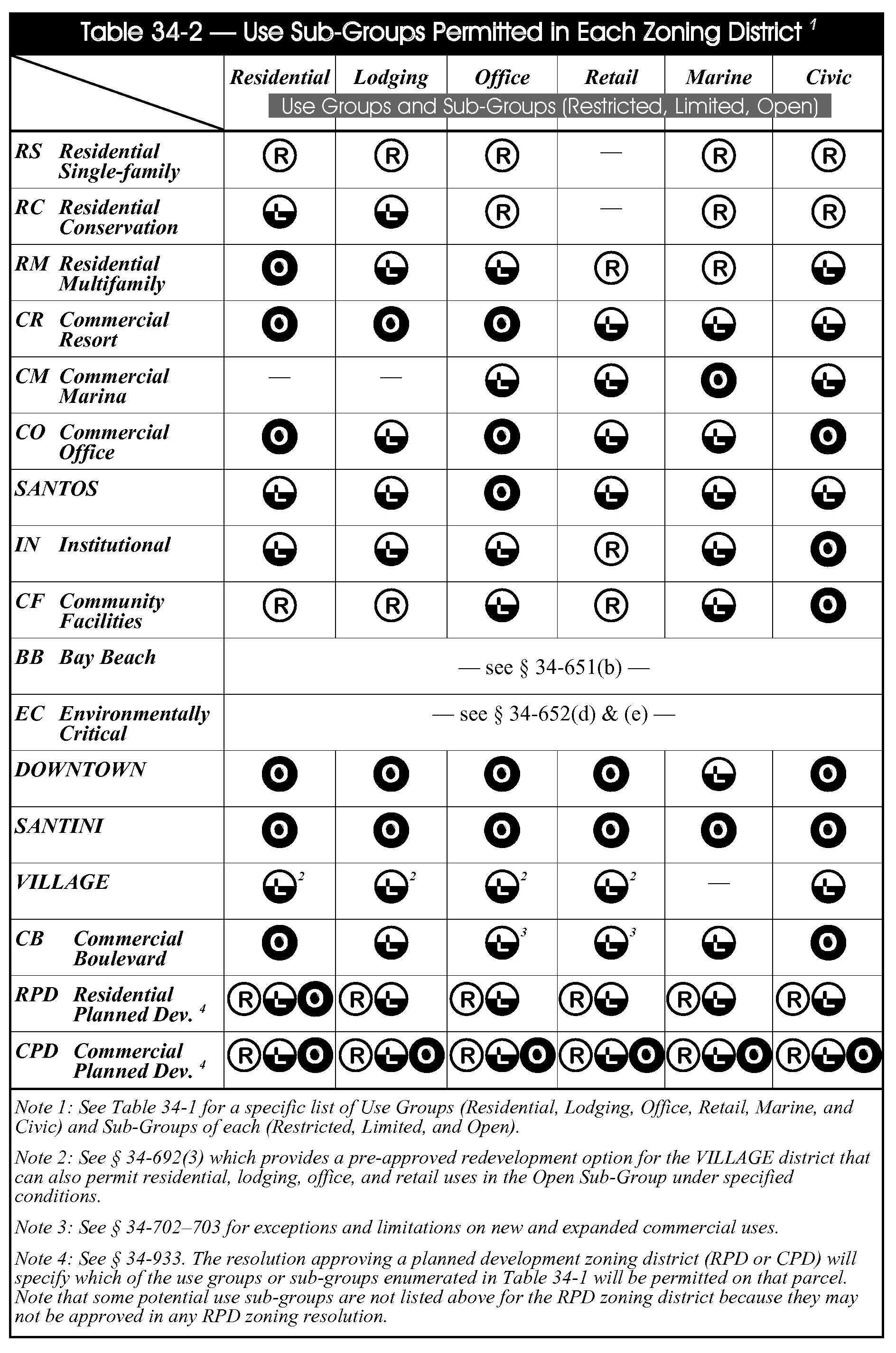 Allowable principal and accessory land uses in an RPD zoning district shall be established in each zoning resolution in accordance with § 34-933 of this chapter. Certain of the use sub-groups enumerated in Table 34-1 are not available in RPD zoning districts; see footnotes under Table 34-2.