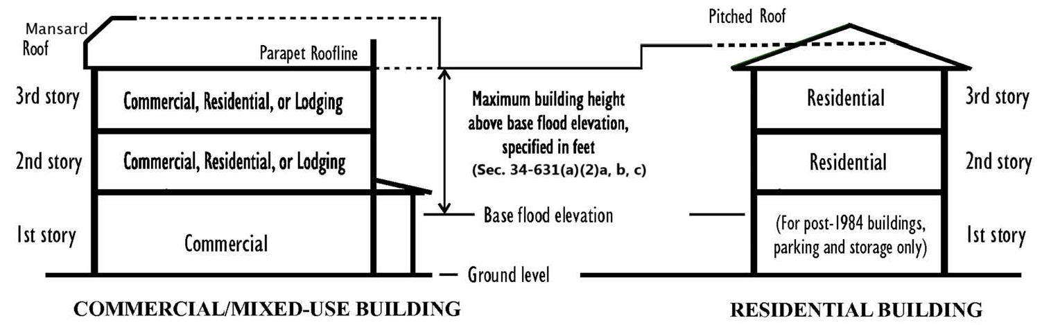 For properties that front on the bay side of Estero Boulevard and all streets other than Estero Boulevard, a maximum of 30 feet above base flood elevation and no taller than three stories.