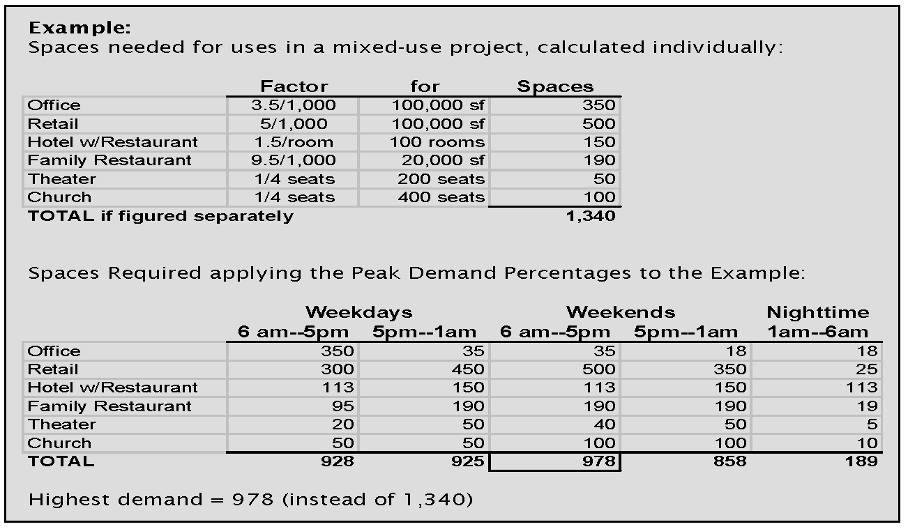 By way of example, the following illustrates shared parking calculations for a particular mixed-use development: