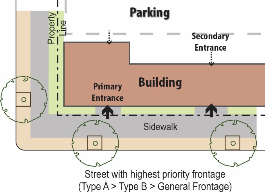 Type A Frontage. Type A Frontage is intended to be the primary pedestrian streets and provide walkable relationships to the buildings and public spaces with pedestrian-oriented design.