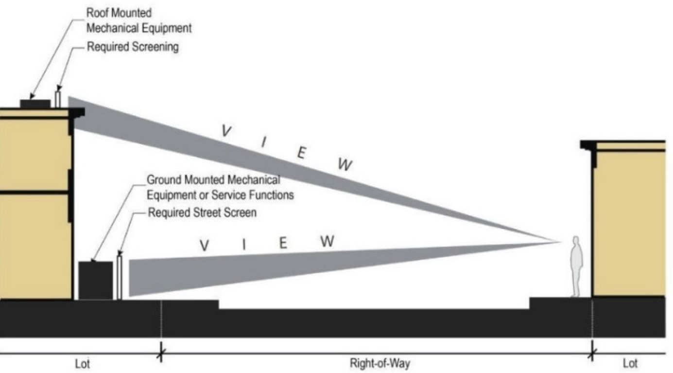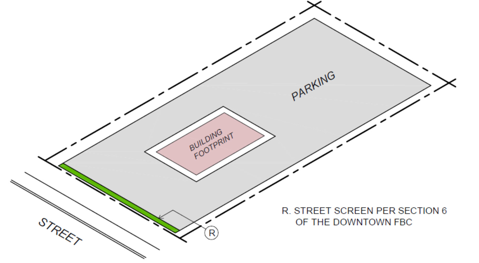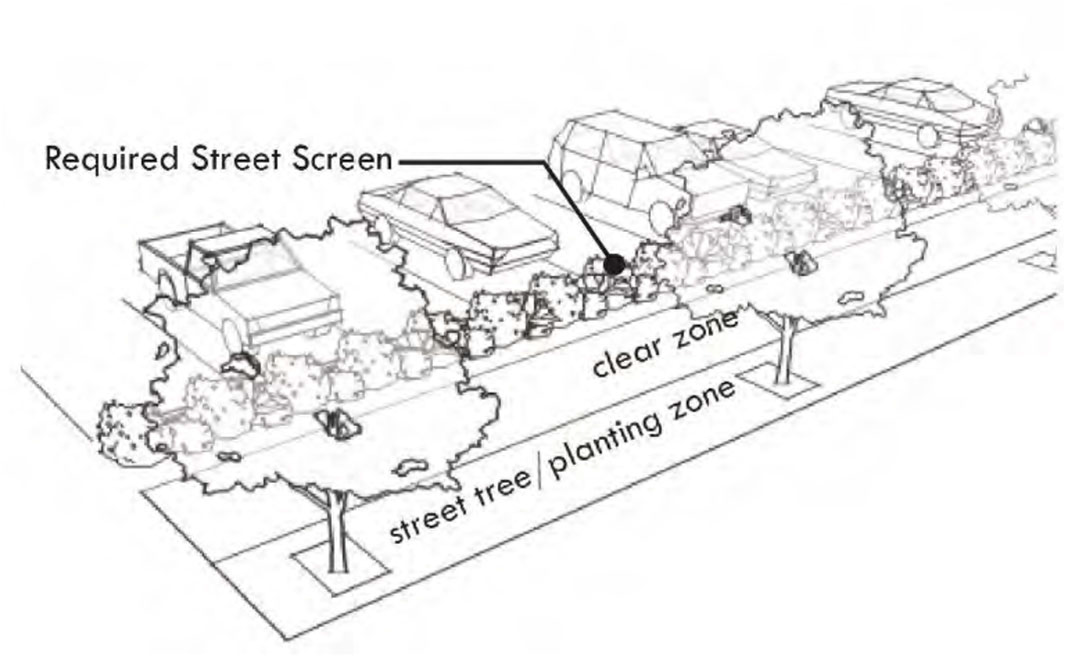 Street Screen means a freestanding wall or living screen built along the BTZ or in line with the building façade line along the street. It may mask a parking lot or a loading/service area from view or provide privacy to a side yard and/or strengthen the spatial definition of the public realm.