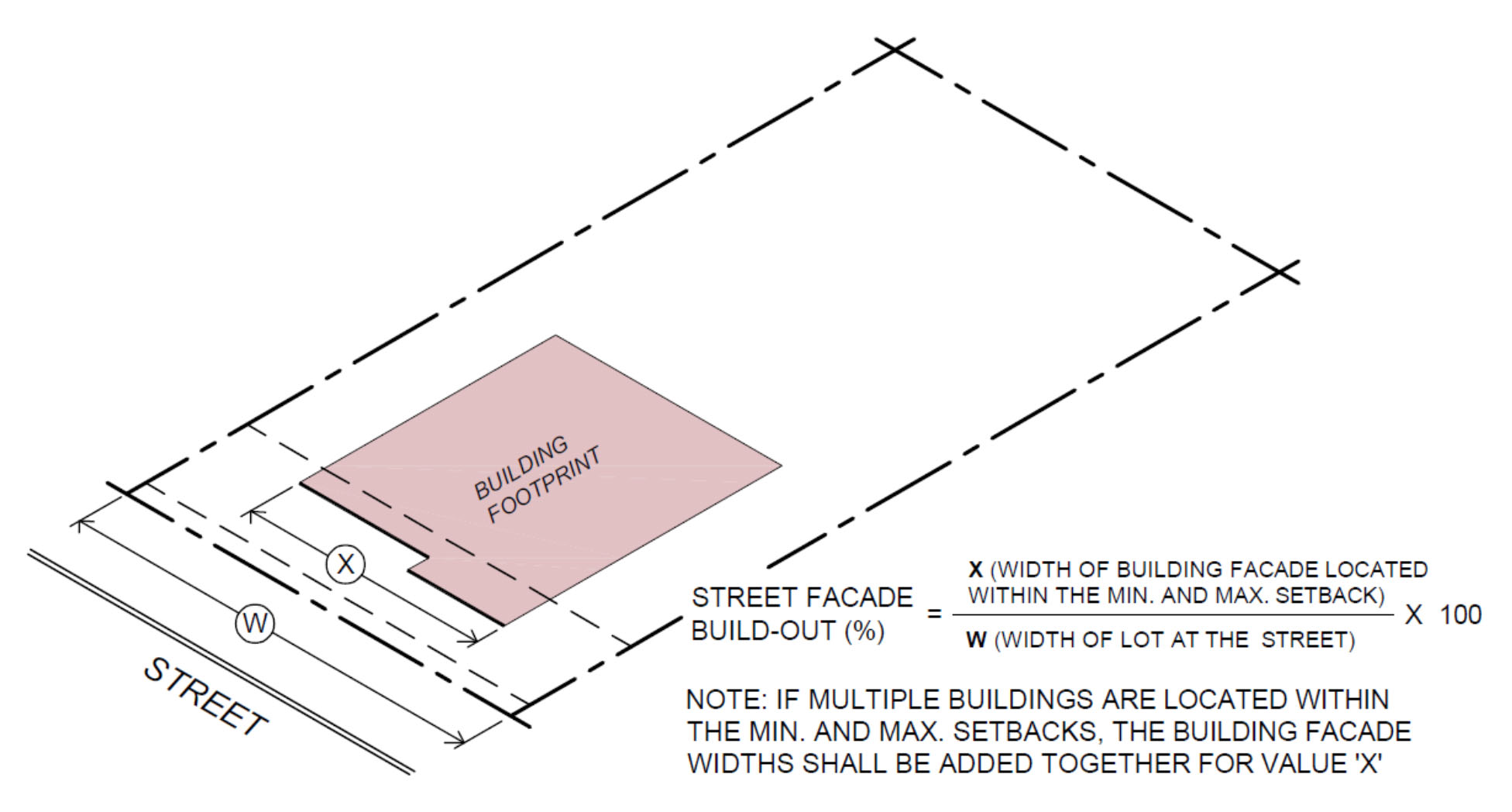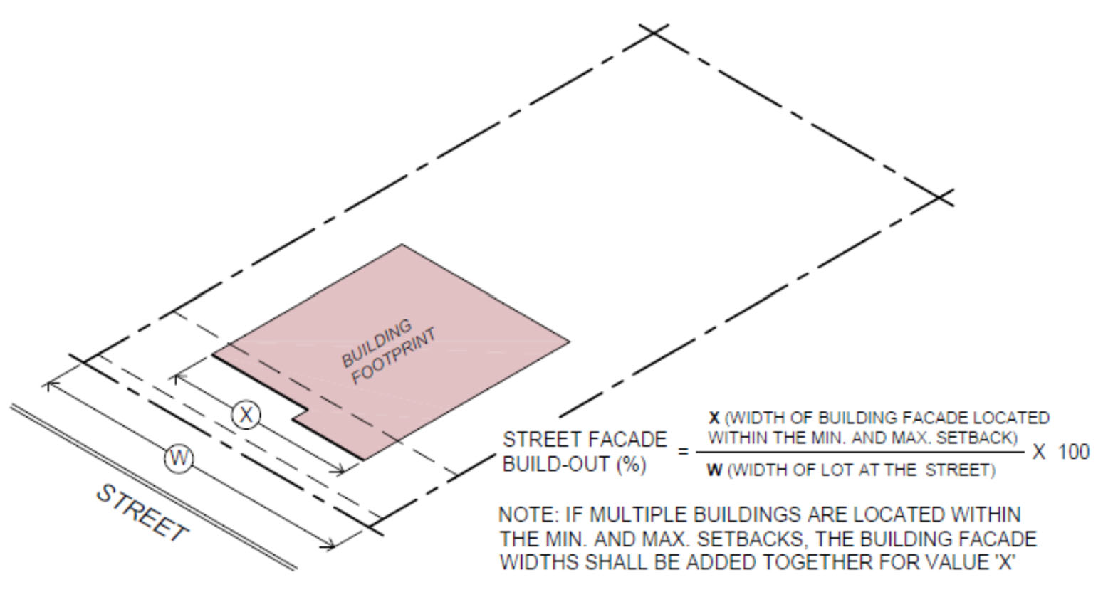 Street Façade Build-out means the percentage of a building's front façade that is required to be located within the front setback range as a proportion of that lot's width along the public street. Parks, plazas, squares and pedestrian passages shall be considered as buildings for the calculation of the Street Façade Build-out. Parking areas shall not be included in the Street Façade Build-out calculation.