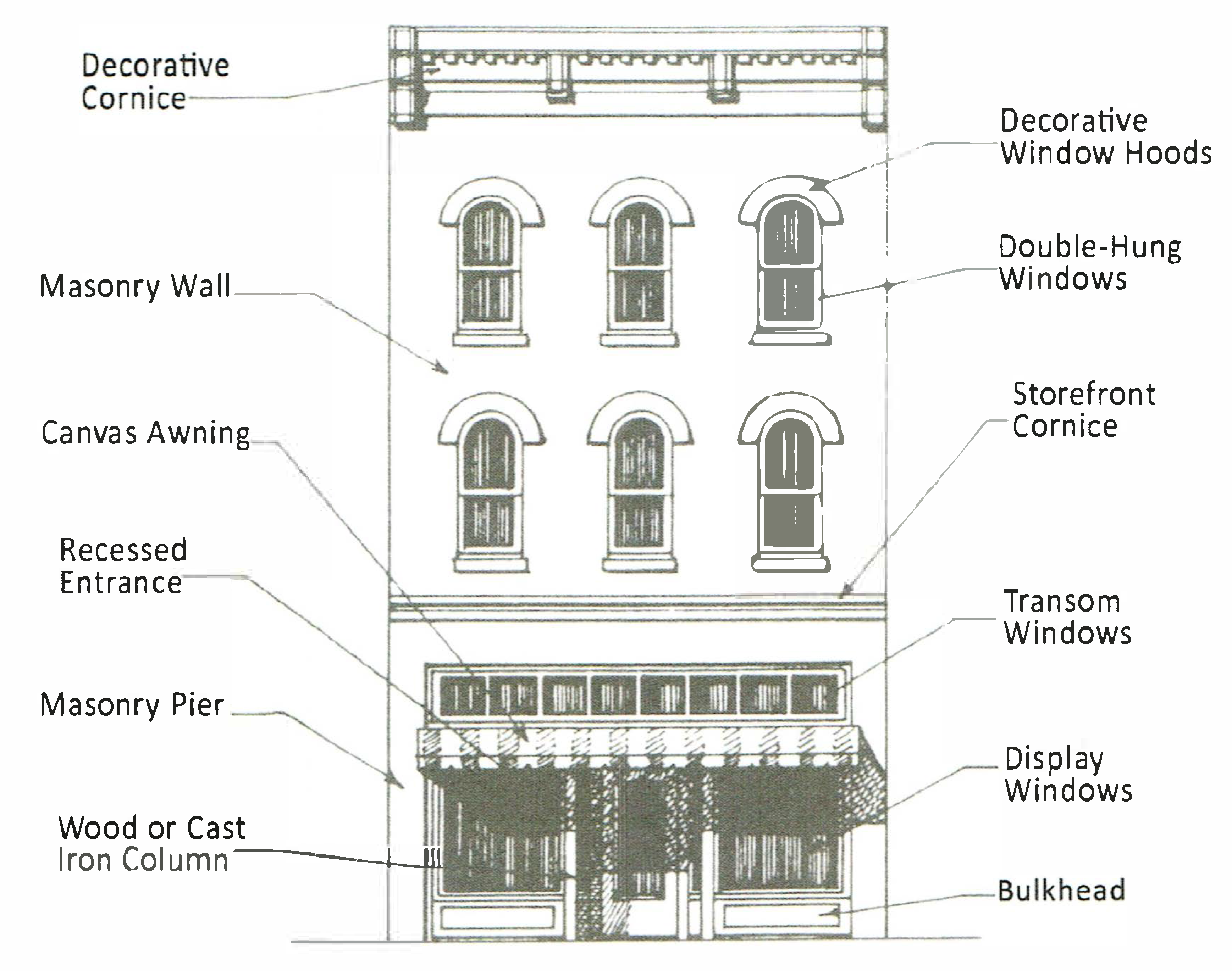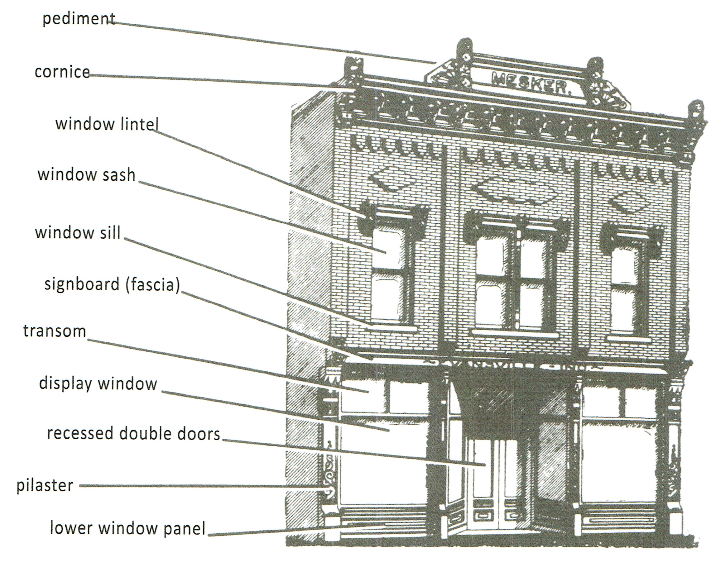 The storefront is the most important architectural feature of many historic commercial buildings. It also plays a crucial role in a business' advertising and merchandising strategy. The storefront has become the feature most commonly altered in a historic commercial building. As more people come to recognized and appreciate the architectural heritage of America's downtowns, a growing interest can be seen in preserving the historic character of commercial buildings. The basic commercial façade consists of three parts: the storefront, with an entrance and display windows; the upper façade, usually with regularly spaced windows; and the cornice, which caps the building. Although these components appear in many shapes and styles, the result is essentially the same traditional façade.