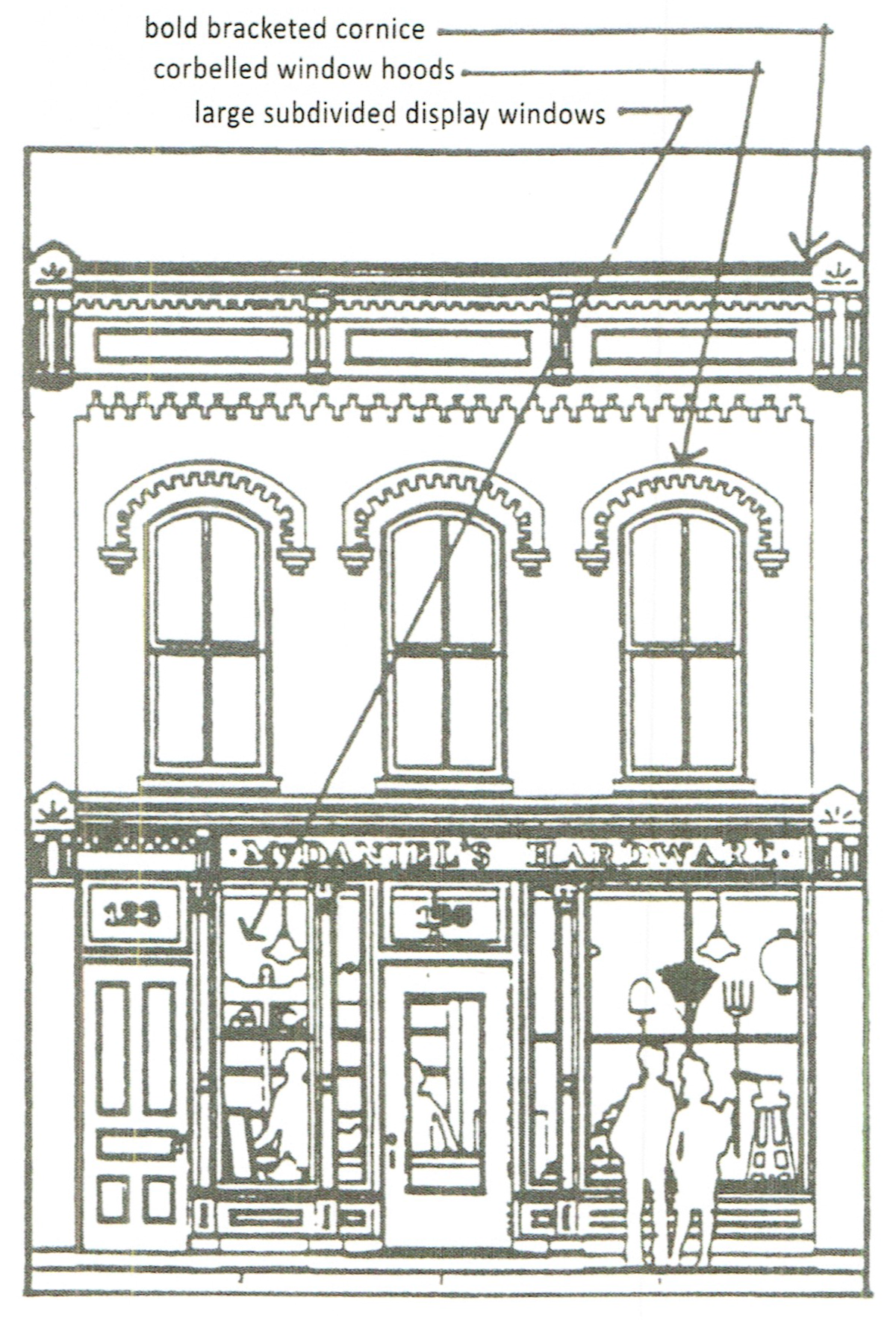 This style was popular for commercial buildings and for private homes during the time when many towns and cities were buildings and growing. Many main streets consist of one Italianate façade after another, side by side, lining the street. The decorated upper stories of these buildings can be seen standing with dignity over the storefronts. They are usually made of simple red brick with a wood or metal bracketed cornice projecting out over the street at the top. Just under the cornice there is often a decoration of corbelled brick. ("Corbelled" means a design laid in a stair step fashion out from the building.) Corbelled brick was also used extensively in the decorative hoods over the windows as was cast iron and sometimes wood. In its original form, a second, smaller cornice capped the tall storefront, which also featured decorative columns, perhaps of cast iron, and large subdivided windows.