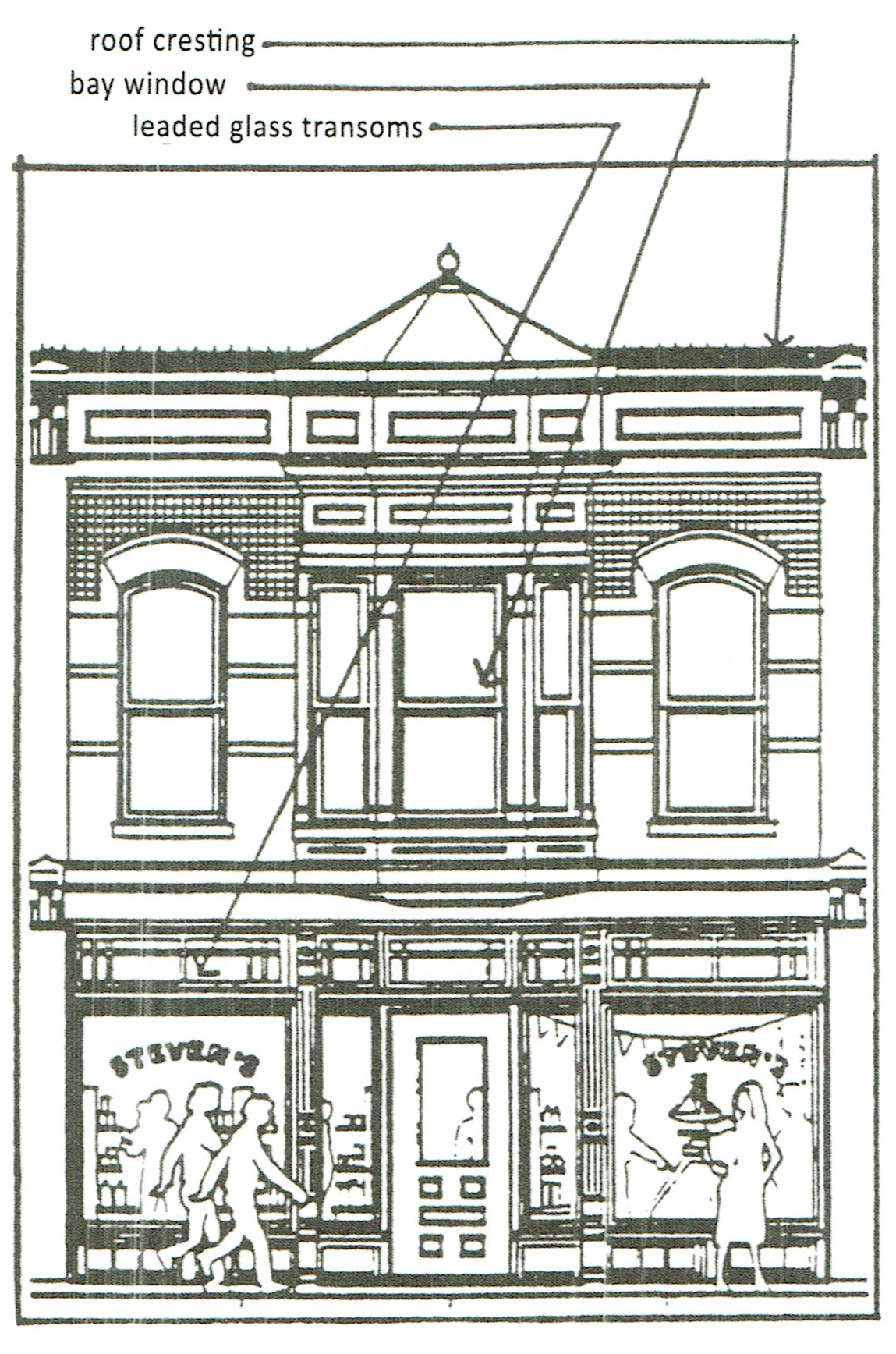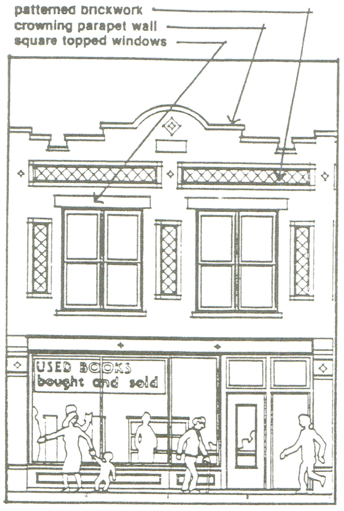 The original scaled, proportion and character of the building should be retained. The building should not be increased or decreased in overall height; stories should not be added or removed from the building. It is also important to retain or restore all original window, doorway and alleyway openings in the front façade. In many cases it will be necessary to remove brick and other types of infill in existing openings. The openings should be restored to their original size, shape and proportions. New openings should not be created in the front façade. The locations of window, storefront and doorway openings are the most visually important design elements on the front façade. It is of paramount importance to respect the nature and character of these openings in order to maintain the original scale of the building. Buildings with multiple storefronts should also be restored to the original design treatments.
