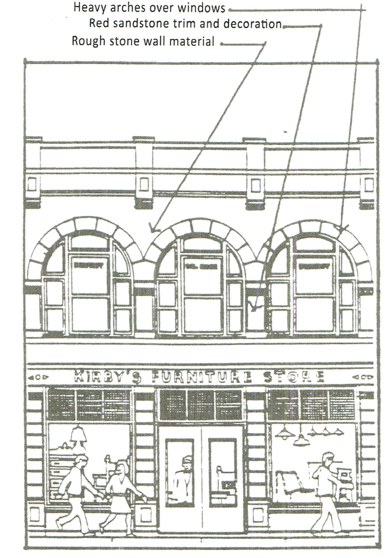 The distinctive trait of a Romanesque façade is the use of the semi-circular arch, used singularly or in a series. Invariably it was a masonry building that was roughhewn and massive, a red brick or stone façade with rusticated red sandstone trim. Granite, terra cotta, and pressed brick were also common. Massive arches over window and door openings dominated the design, and widows set back into the wall created a sense of great thickness and weight. This style marked the earliest movement away from the exuberant Victorian era toward increased simplicity which eventually led to today's modern commercial architecture.