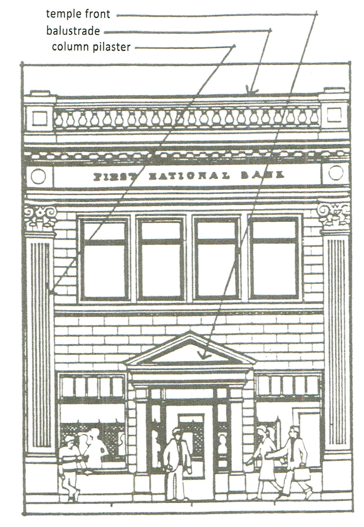 These façades were very formal in character and usually symmetrical in composition. The whole range of classical design motifs was used; the temple front composition (pediment, entablature and columns), columns and rows of dentils (trim under the cornice that looks like rows of teeth), moldings, balustrades. The overall character of the façade was of great refinement.