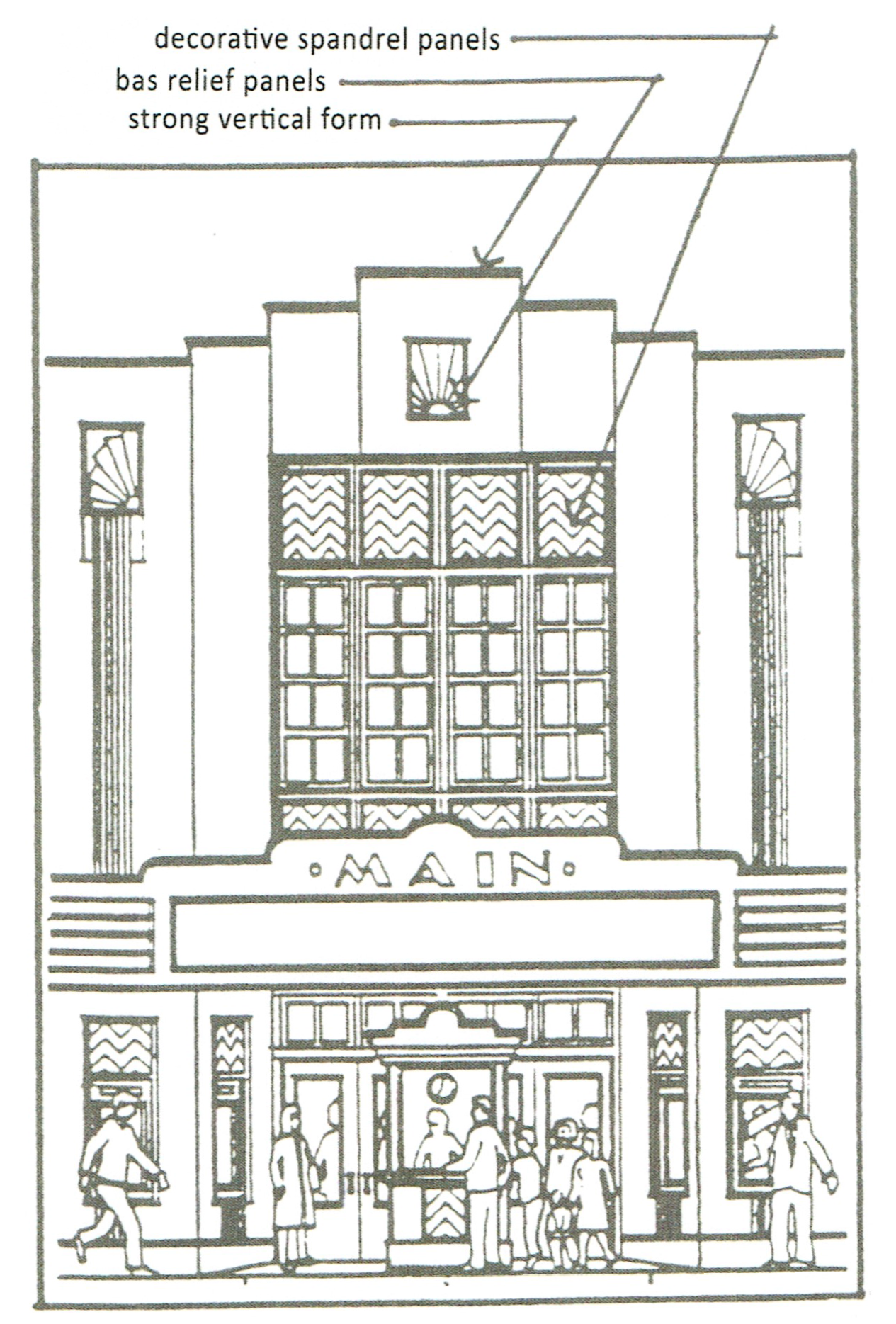 New materials and decorative motifs expressed the culture's changing mood. Metal, opaque, glass, stone and terra cotta were all used in creating the streamlined surfaces. Geometric patterns like chevrons and fluting were played against blank wall areas for dramatic effect. Often stylized bas relief panels were used. Also metal casement windows in groups, often accented by decorative spandrel panels, created powerful visual compositions.
