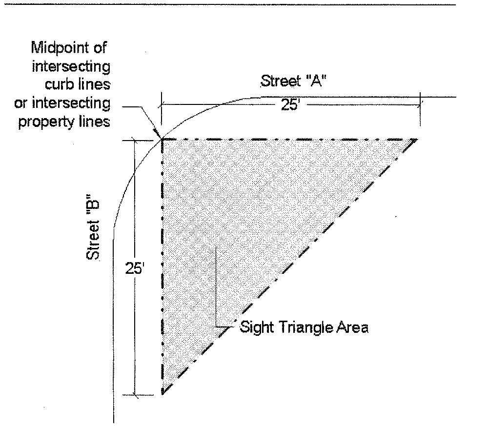 Sight visibility triangle. The sight visibility triangle is the area delineated by the midpoint of the radius intersection of the edge of the pavement, back of street curb, or back of shoulder, and extending 25 feet in length parallel to the edge of each driveway, street curb or shoulder, with the third side connecting the other two sides. Within each sight visibility triangle, no landscape materials, trees, shrubs, buildings, structures, or other obstructions shall be erected, planted, or maintained that exceed 24 inches in height. For signs, up to two supportive posts that are not more than 16 inches in width or diameter are permitted within the sight visibility triangle. For landscaping, the term "height" refers to the height at plant maturity. For purposes of this section, height shall be measured from the street elevation at the edge of the curb or shoulder.