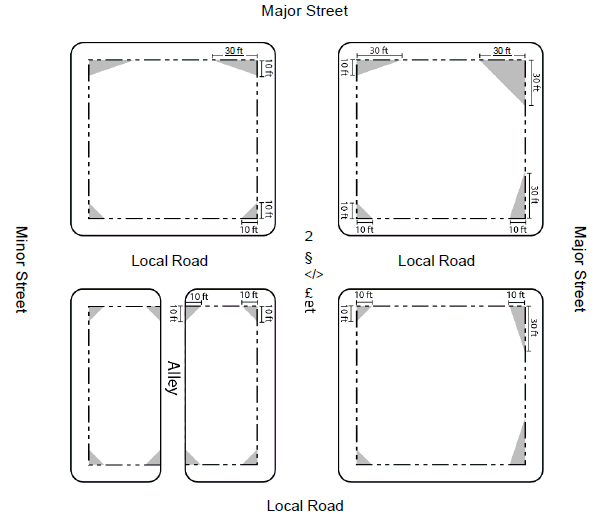 For intersections of a major street to a minor street or local street, the distance measured shall be thirty (30) feet along the major street property line and ten (10) feet along the minor or local street property line.