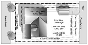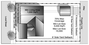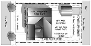 * No garage vehicle entrance from a street or alley shall have a setback of less than 20 feet (to allow for off-street parking between the sidewalk and garage door).