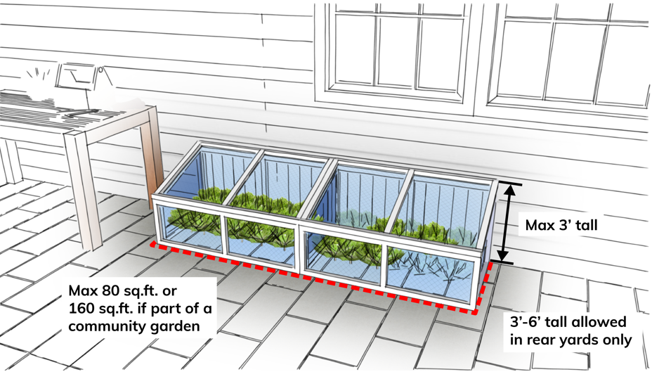 Coldframe gardening structures over three (3) feet in height and up to a maximum of six (6) feet are permitted in the rear and interior side yard.