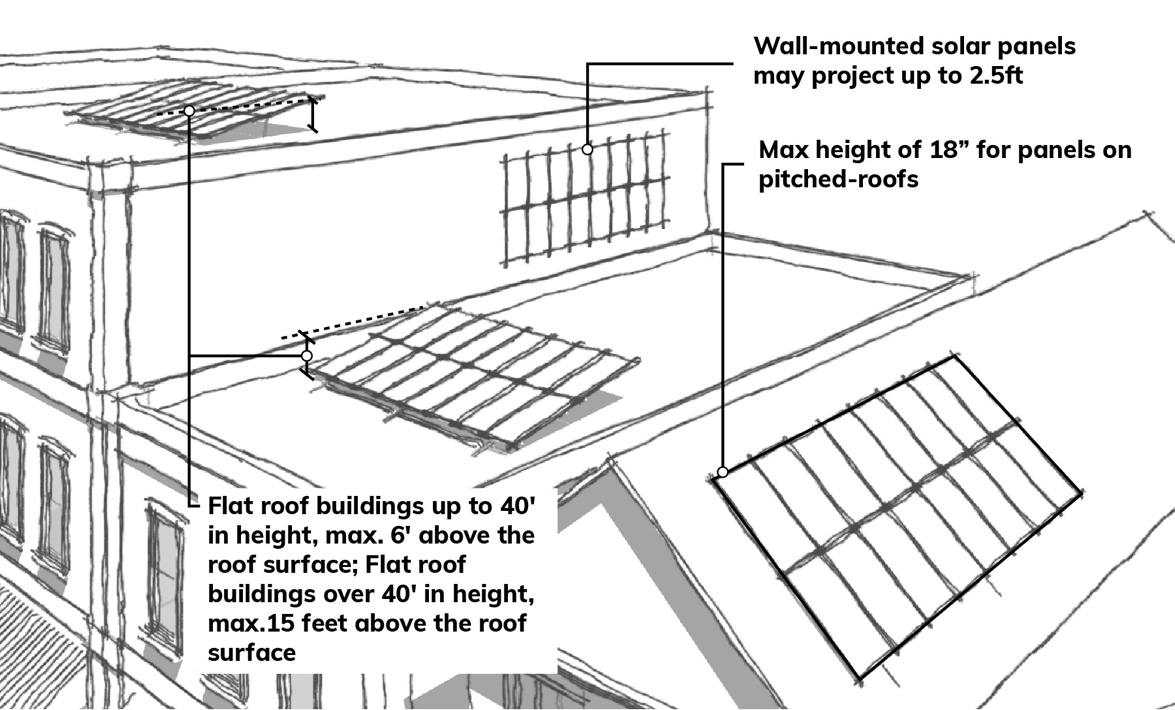 Wall-mounted solar panels may project up to two-and-a-half (2½) feet from a building façade and must be integrated into the structure as an architectural feature.