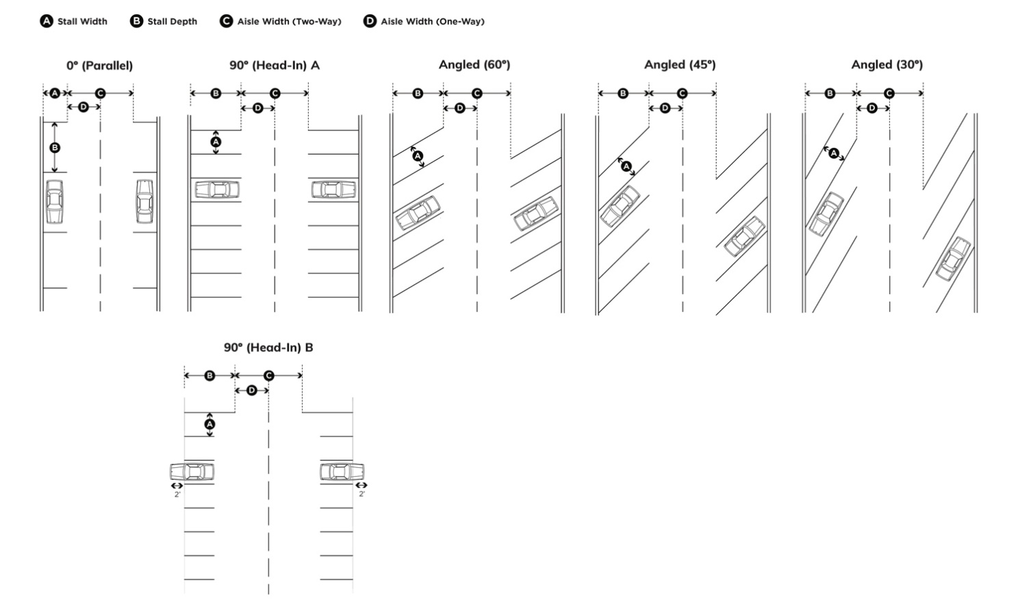 Off-street parking spaces and drive aisles within a parking lot or structure must be designed in accordance with the minimum dimensions in Table 11-1: Off-Street Parking Space Minimum Dimensions. Other parking angles other than those described in Table 11-1 are permitted but must be approved by the Zoning Administrator and provide evidence of safe and efficient parking configuration and traffic circulation.