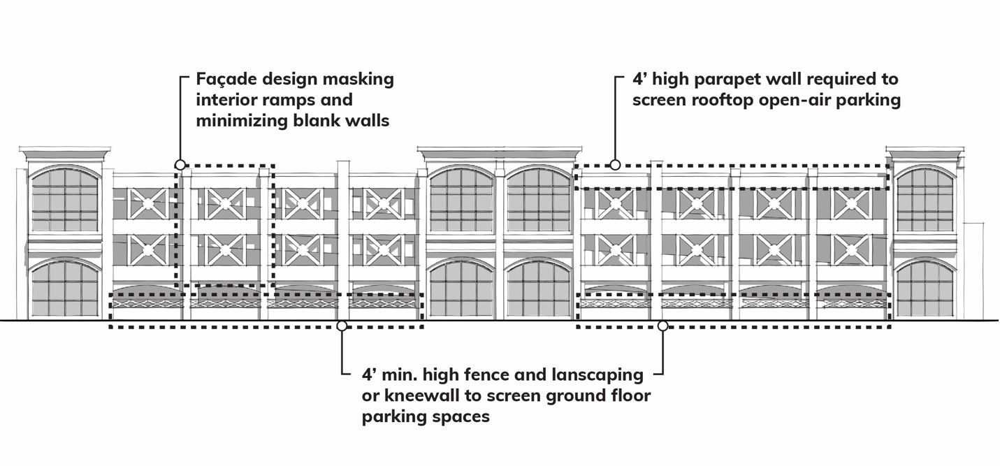On facades that front on public streets, façade design and screening must mask interior ramps.