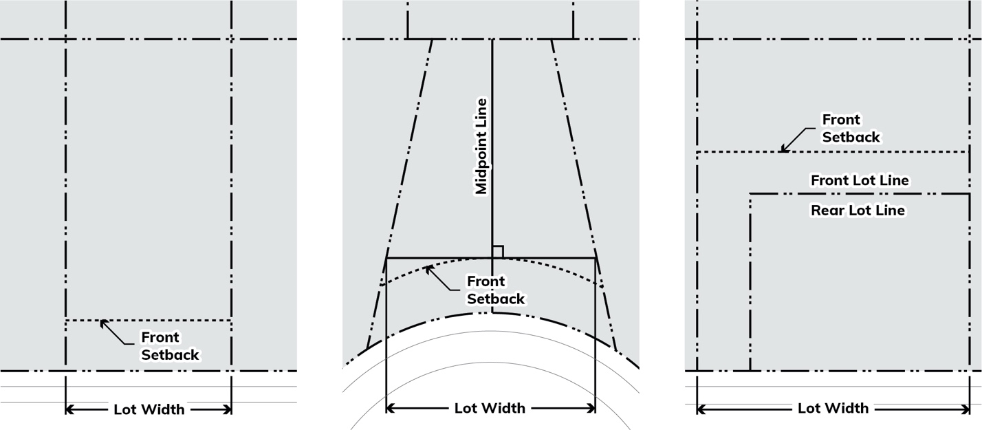 On a lot with a radial (curved) front lot line, the required front setback, as measured from the right-of-way line follows the curve of the lot line.