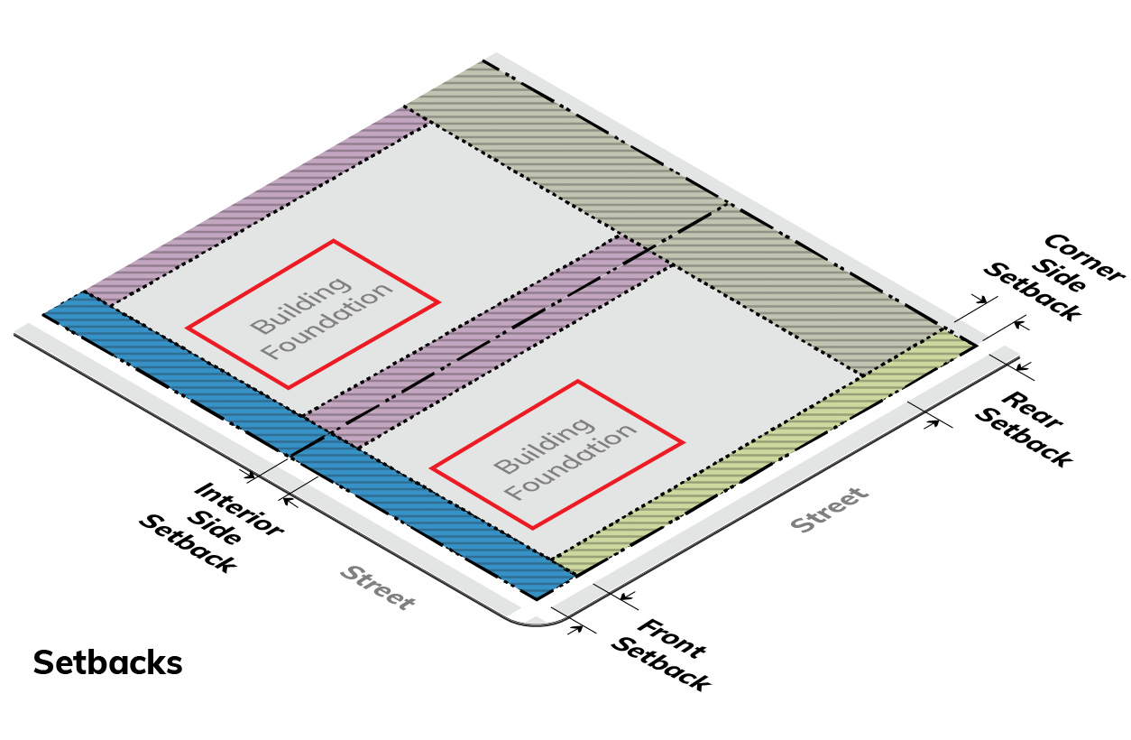 Interior side setback. An interior side setback is the required minimum distance per the zoning district that a principal building must be located from the interior side lot line. The interior side setback extends along the interior side lot line between the front and rear setback, measured perpendicular to the interior side lot line.