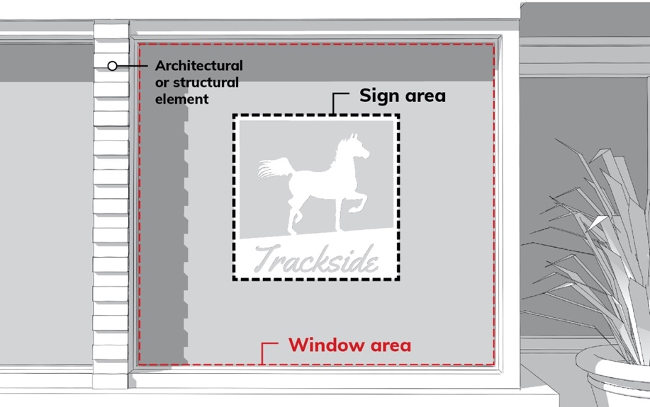 Window area for the purpose of calculating maximum area of window signs is calculated as a continuous surface until divided by an architectural or structural element. Mullions are not considered an element that divides window area. Total window area is calculated as length times width of the window area. Only the individual letters or logos of the window sign shall be used in the calculation of surface area. The transparent film around the perimeter of the individual letters or logos comprising the window sign and used to affix the window sign to the interior or exterior of a windowpane or glass door shall be exempt from the area calculations, provided that such portion of the transparent film maintains one hundred (100) percent transparency of the window.