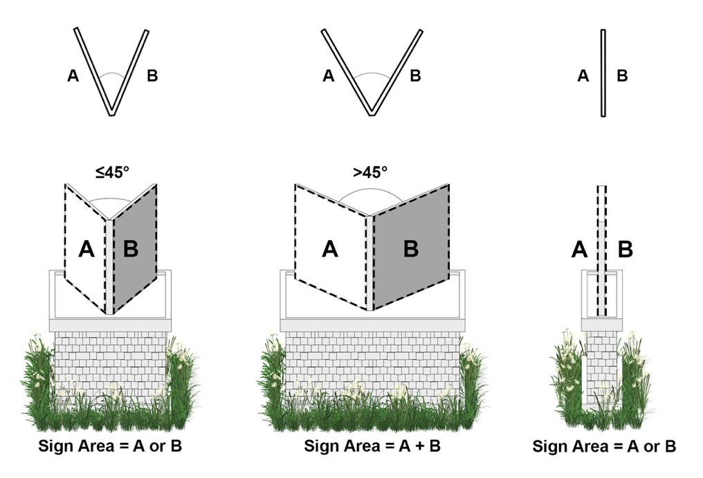 Sign face calculation. If the interior angle between two (2) sign faces is forty-five (45) degrees or less, the sign area is computed as the area of one face only. If the angle between two (2) sign faces is greater than forty-five (45) degrees, the total sign area is computed as the sum of the areas of the two (2) faces.