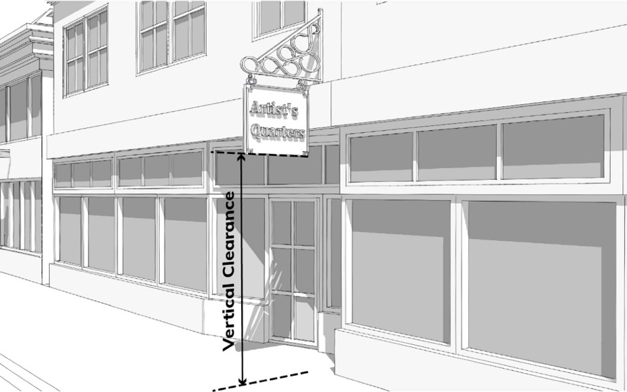 Sign, vertical clearance. Vertical clearance is measured as the vertical distance measured from the ground directly below the sign to the lowest point of the sign.